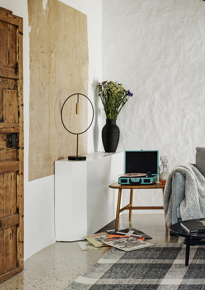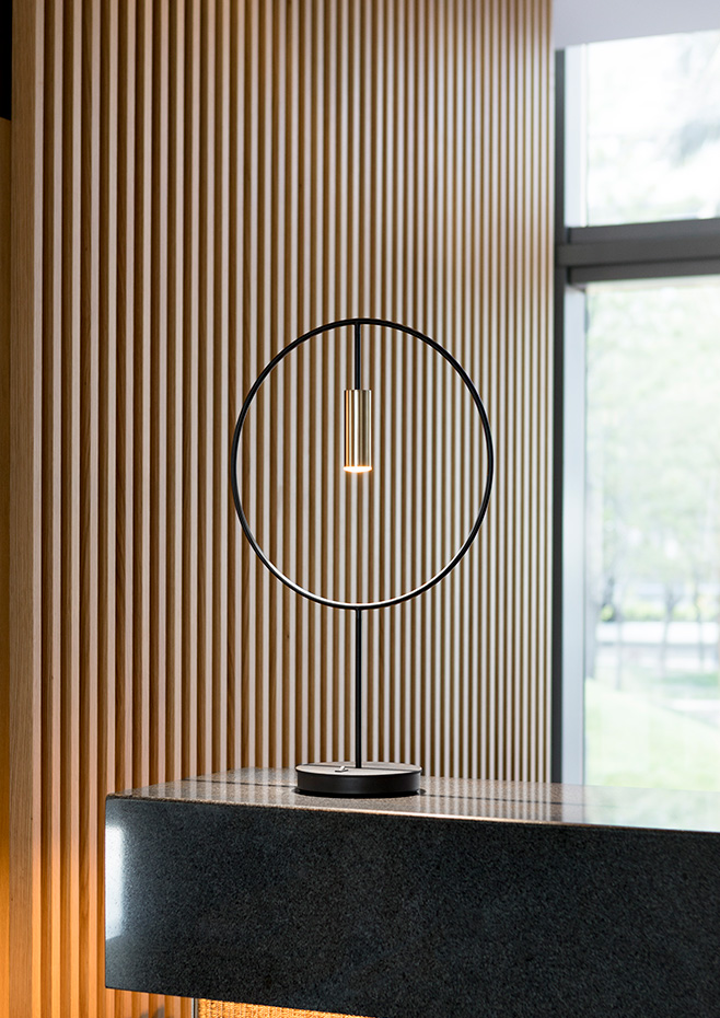 Table lamp with a circular body, cylindrical aluminium head and acrylic (PMMA) lens diffuser. Integrated sensor dimmable LED.