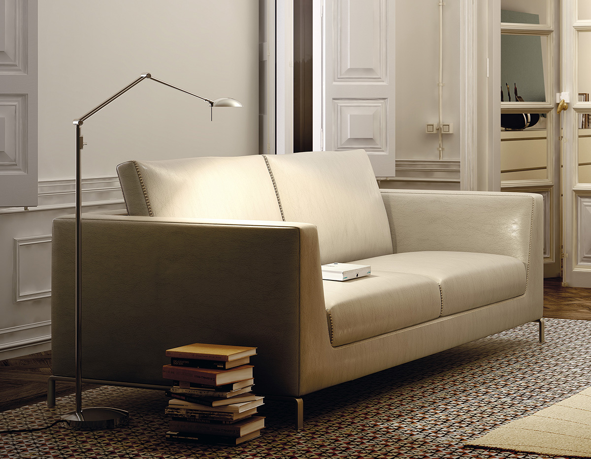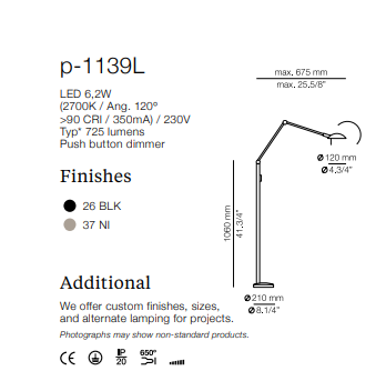 Metallic reading lamp with extensible reading arm and articulate head, providing direct or indirect light. Integrated LED with push button dimmer.