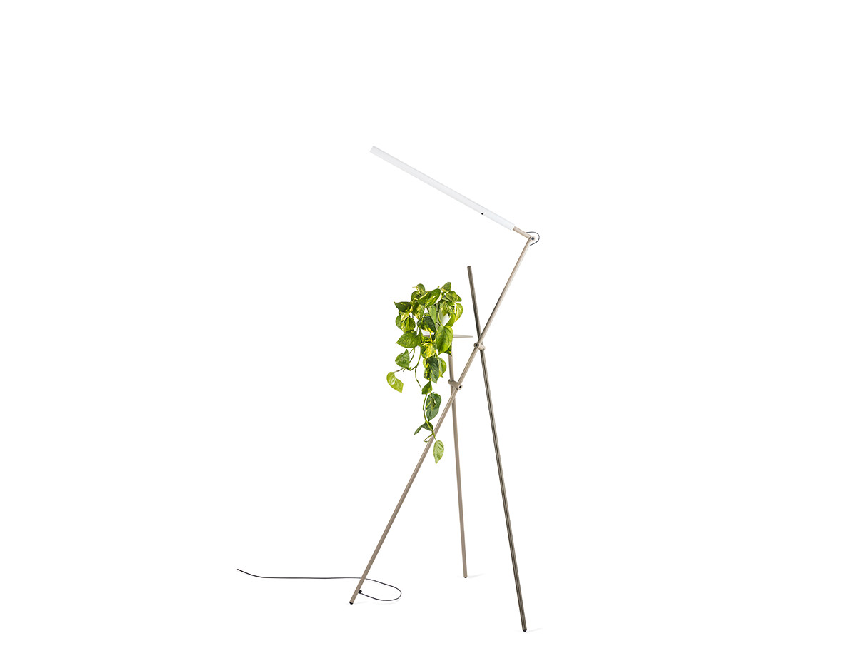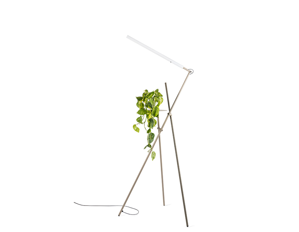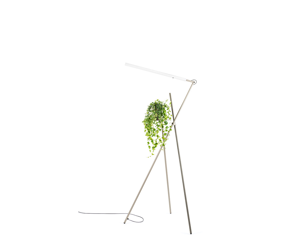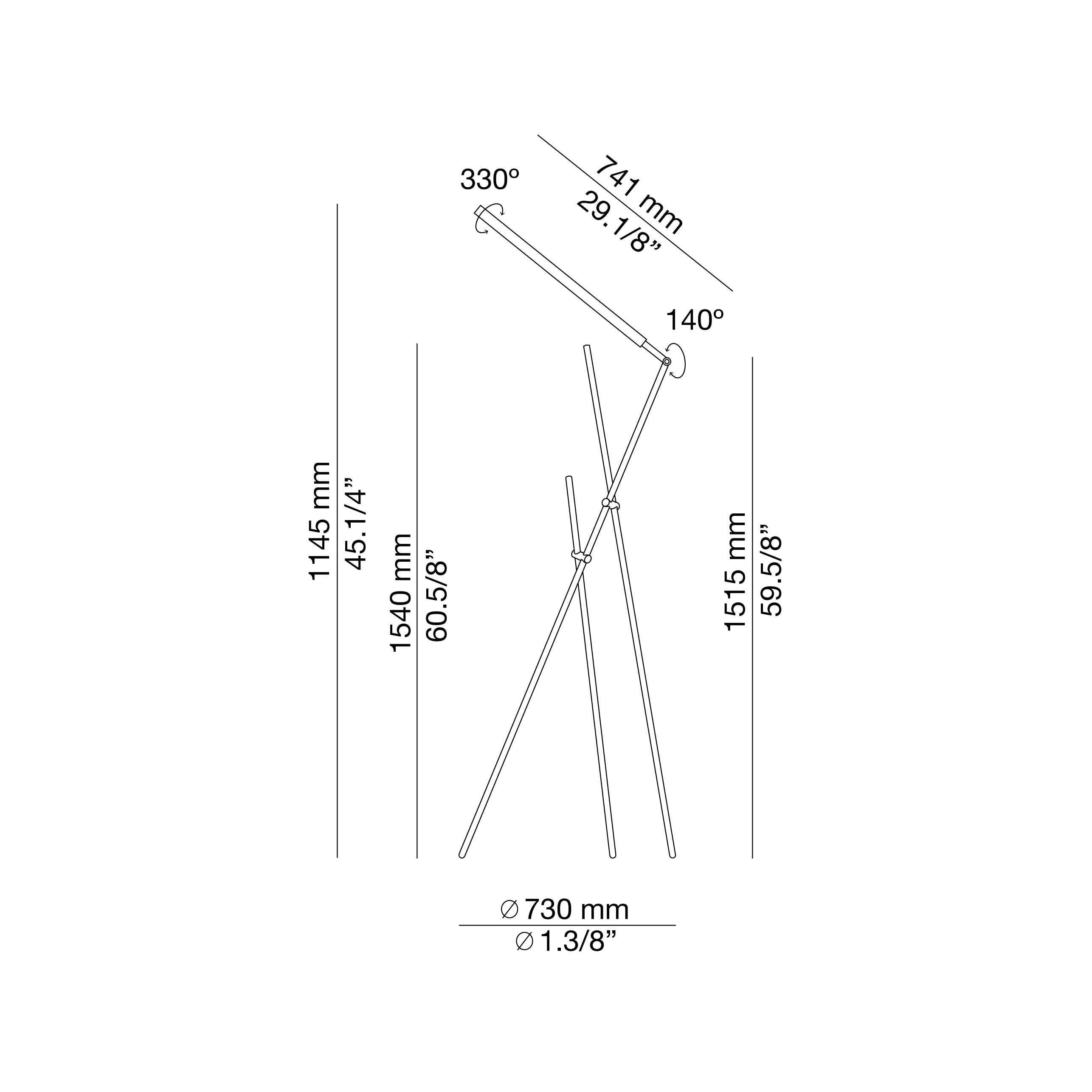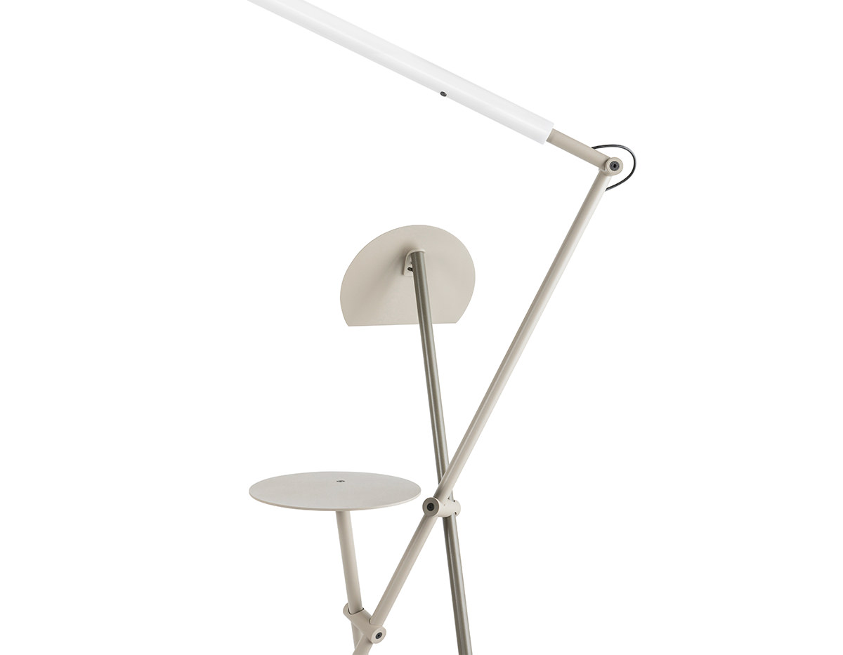 Metallic floor lamp with three multifunctional arms. Direct and indirect light provided by an adjustable arm with acrylic diffuser and integrated dimmable LED on the stem. Accessories can be added to the stems such as a table or magazine holder.