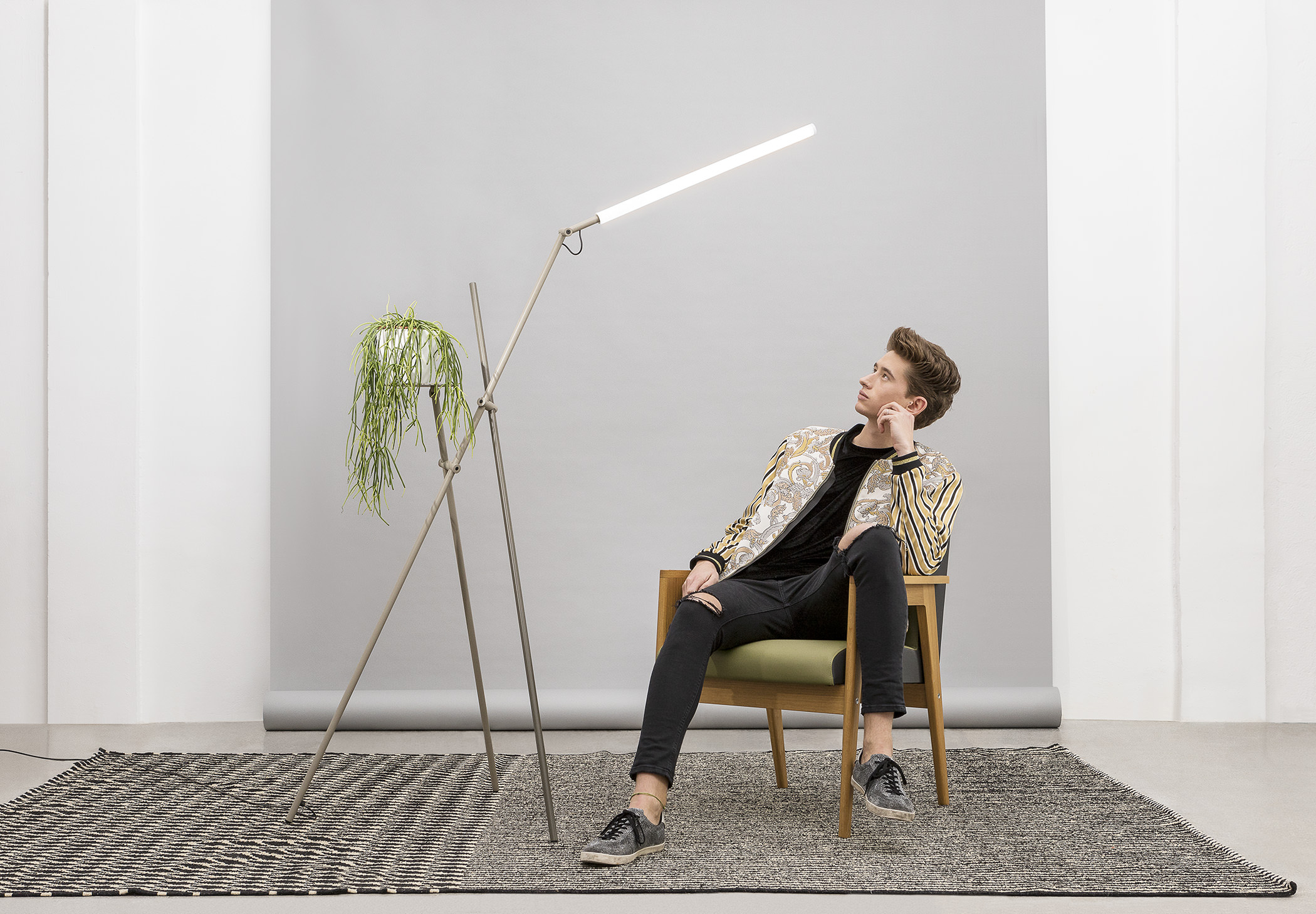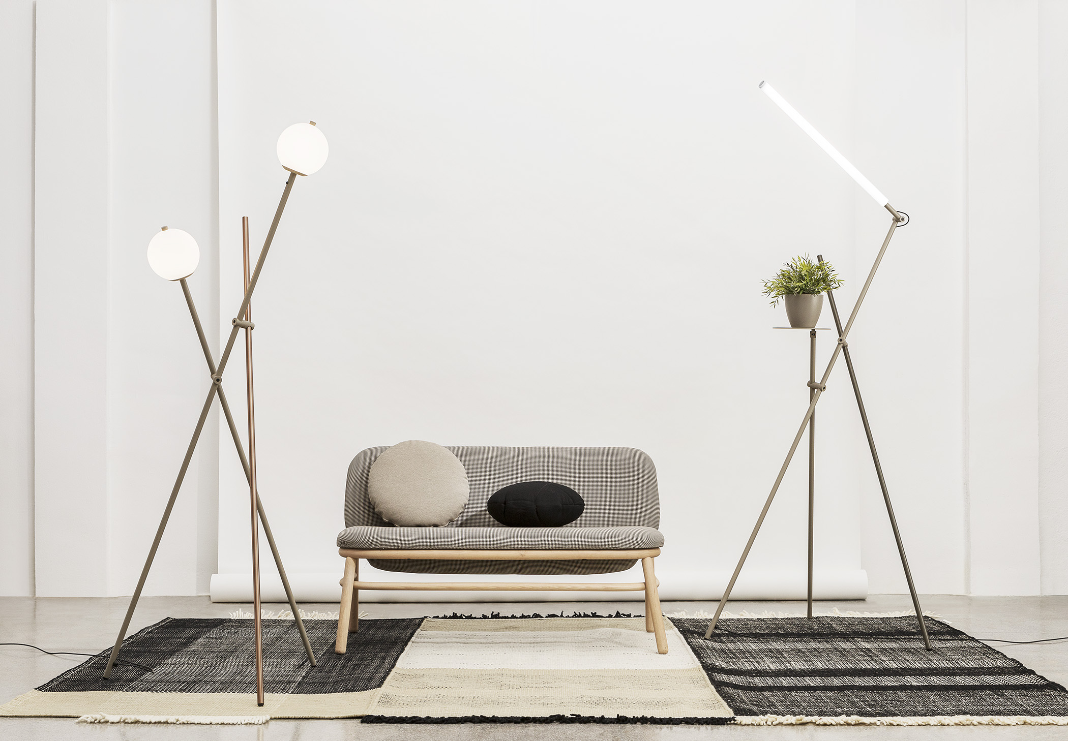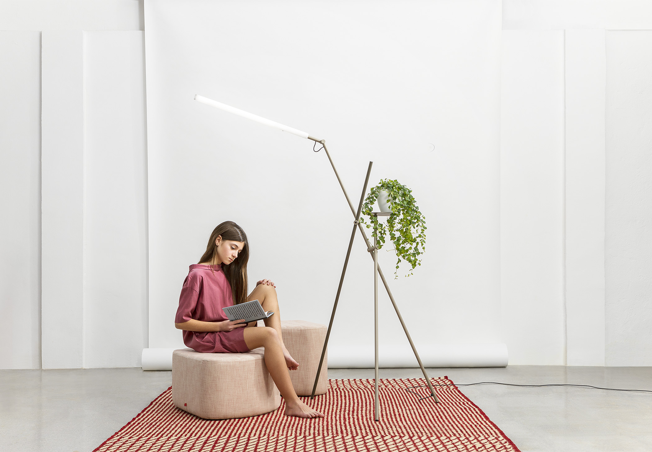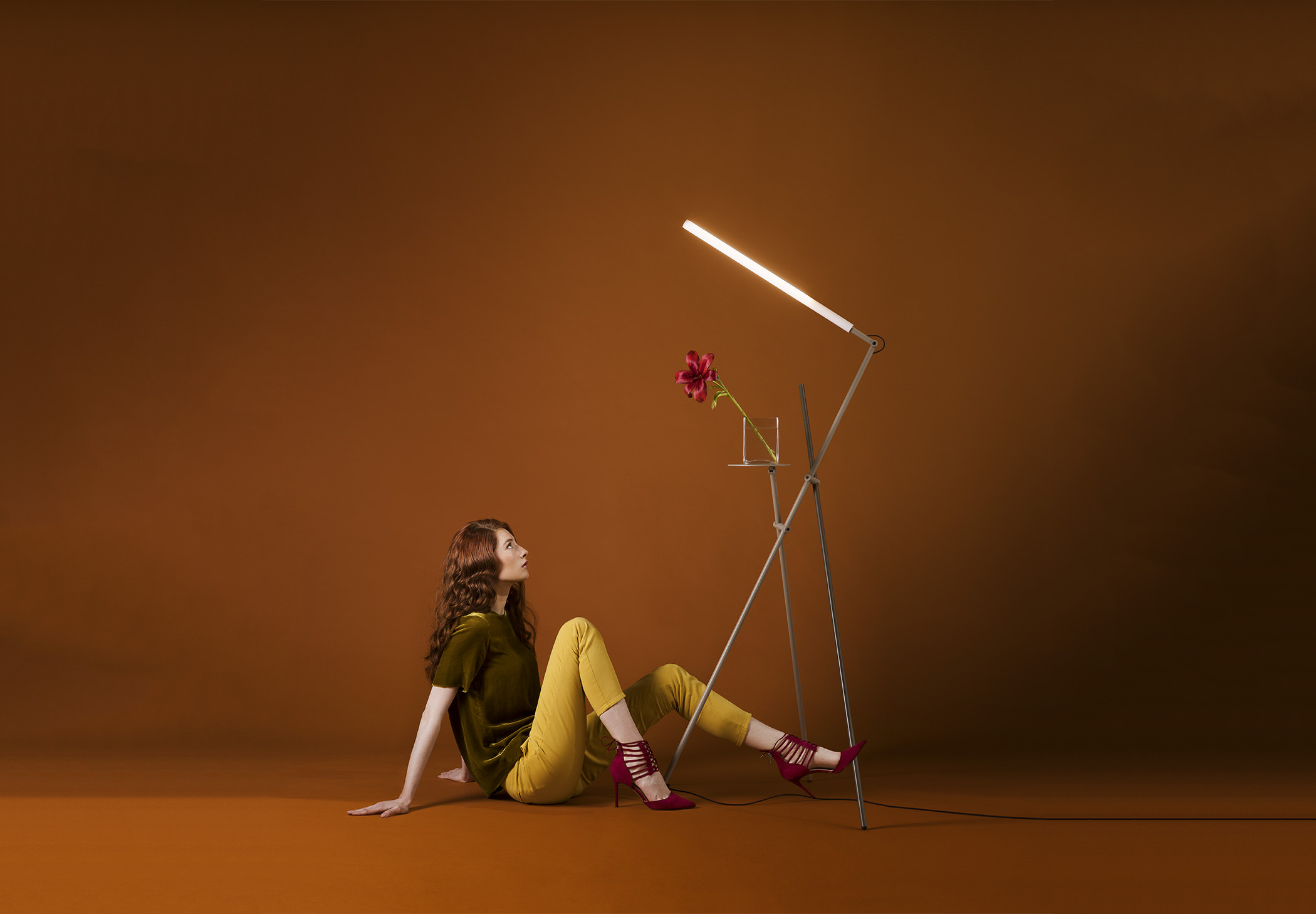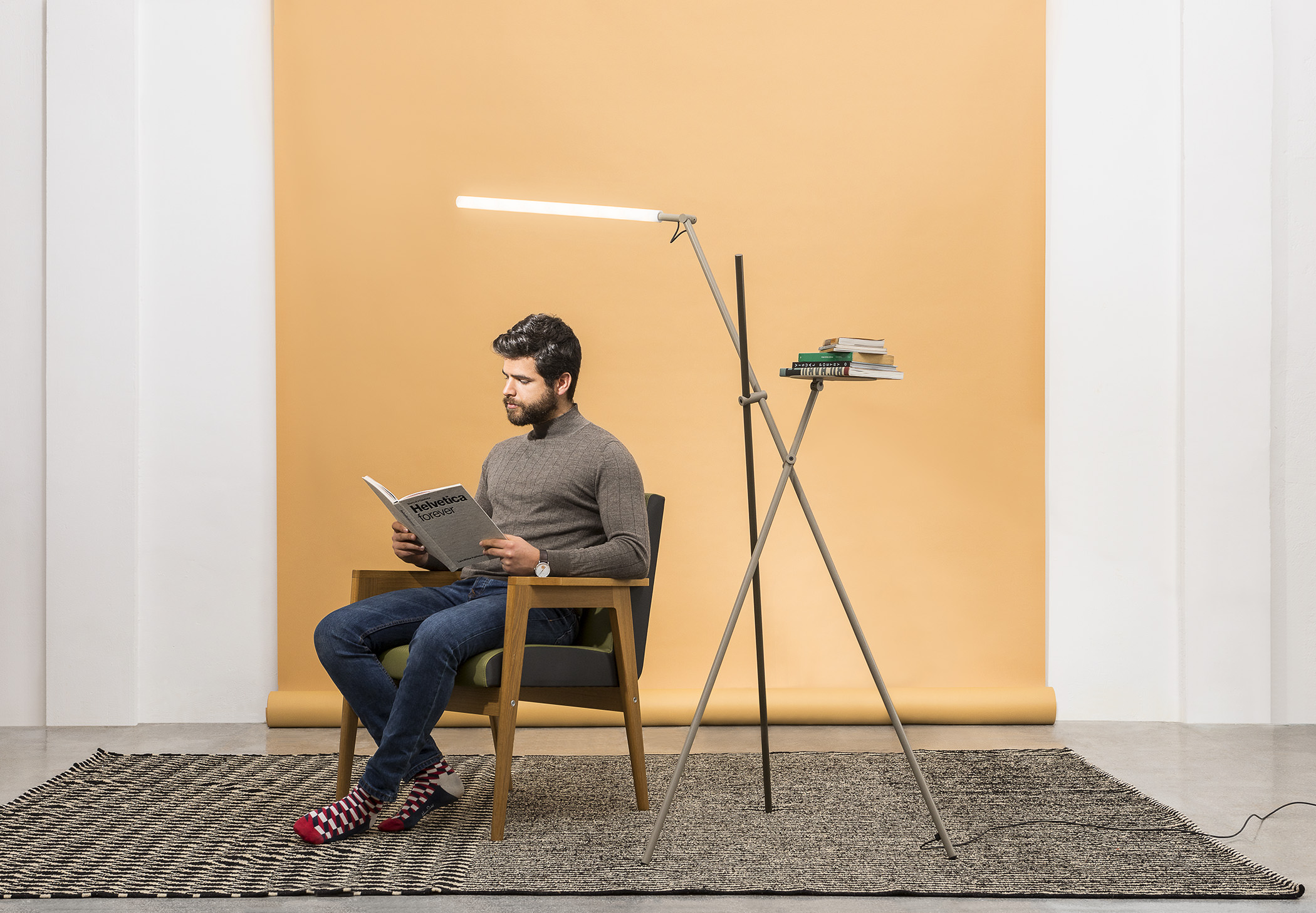 Metallic floor lamp with three multifunctional arms. Direct and indirect light provided by an adjustable arm with acrylic diffuser and integrated dimmable LED on the stem. Accessories can be added to the stems such as a table or magazine holder.