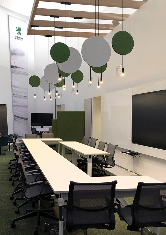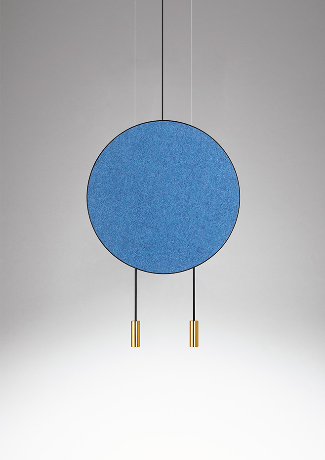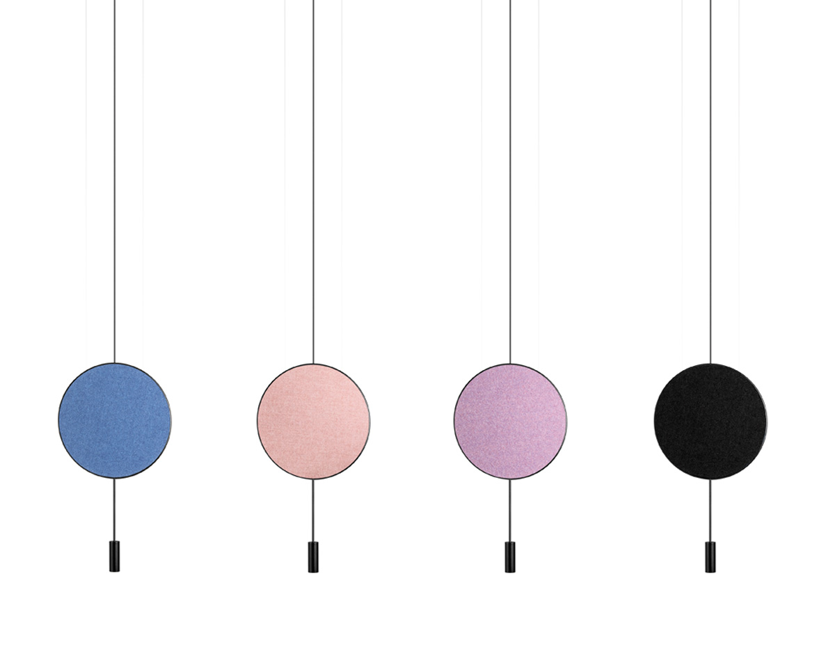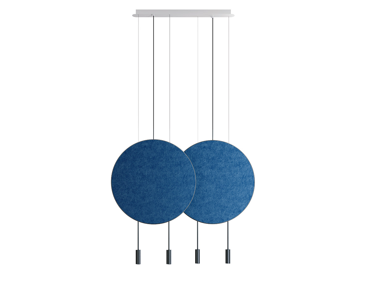 Cylindrical aluminium heads and acrylic (PMMA) lens diffusers. Adjustable height. Optional decorative sound absorbing panel.