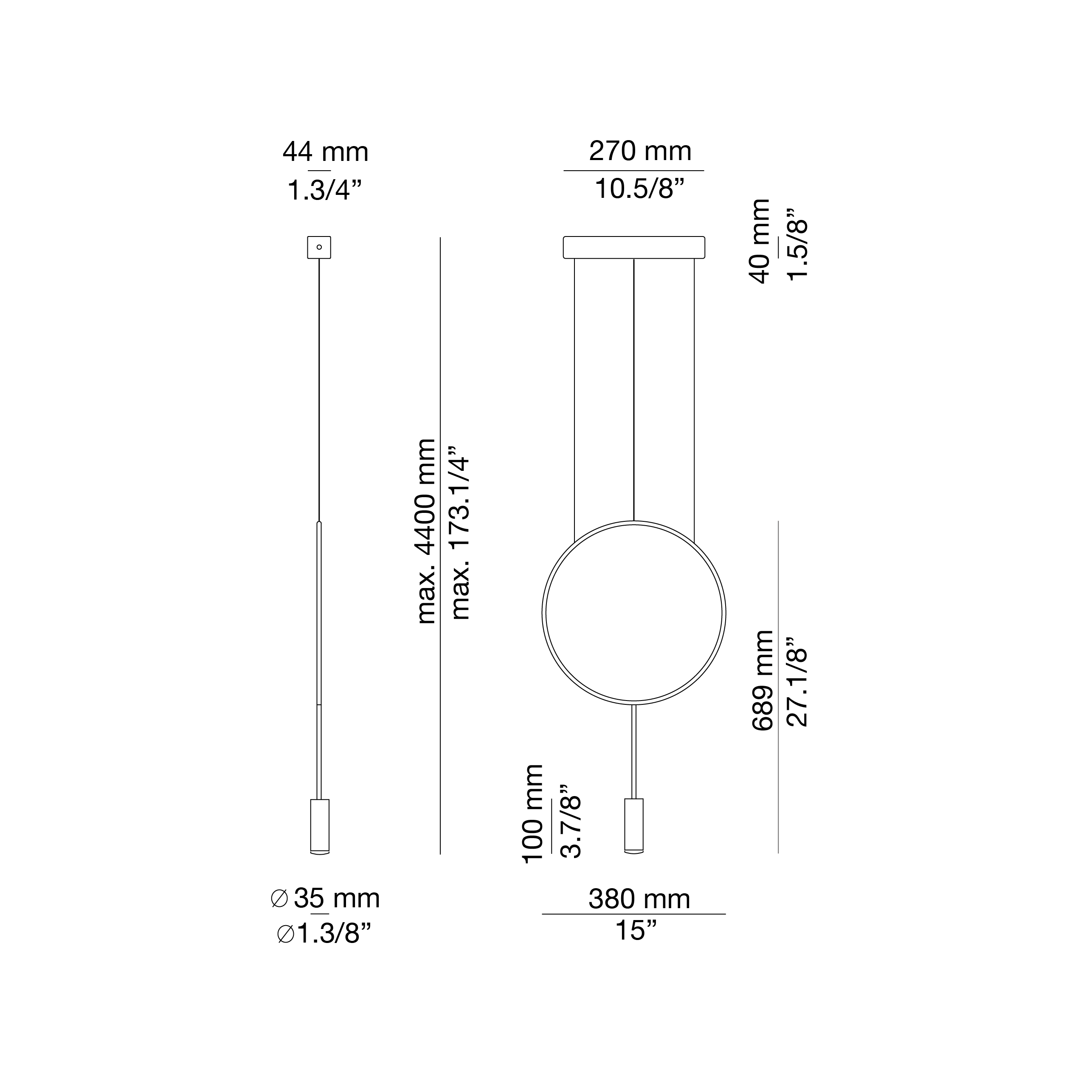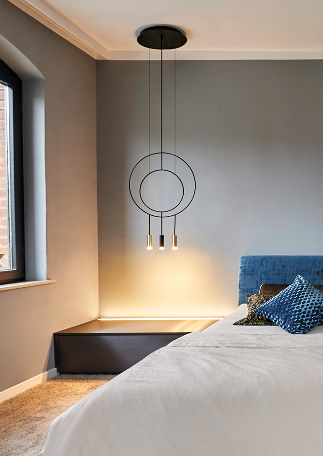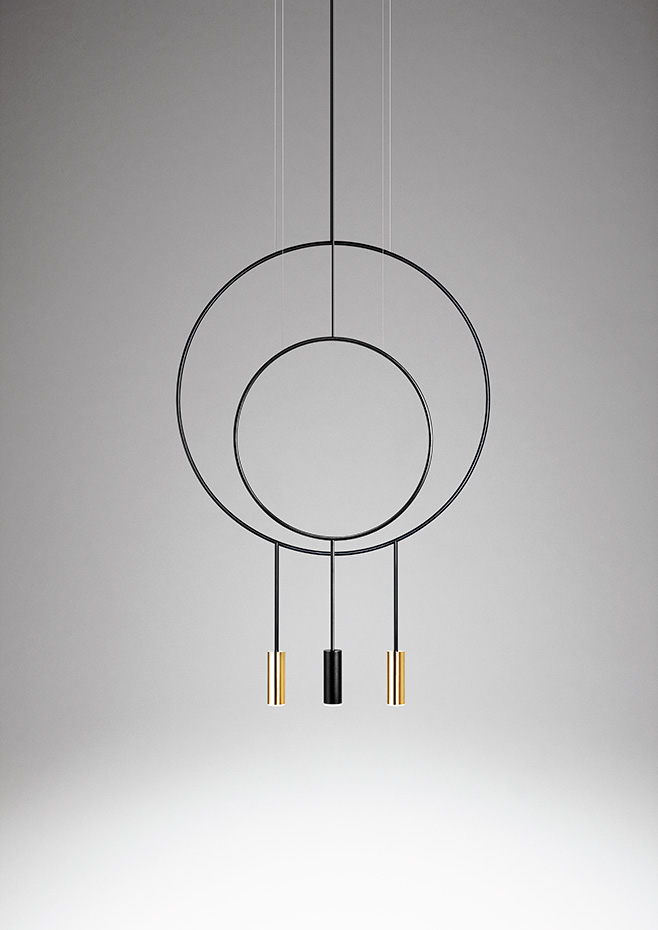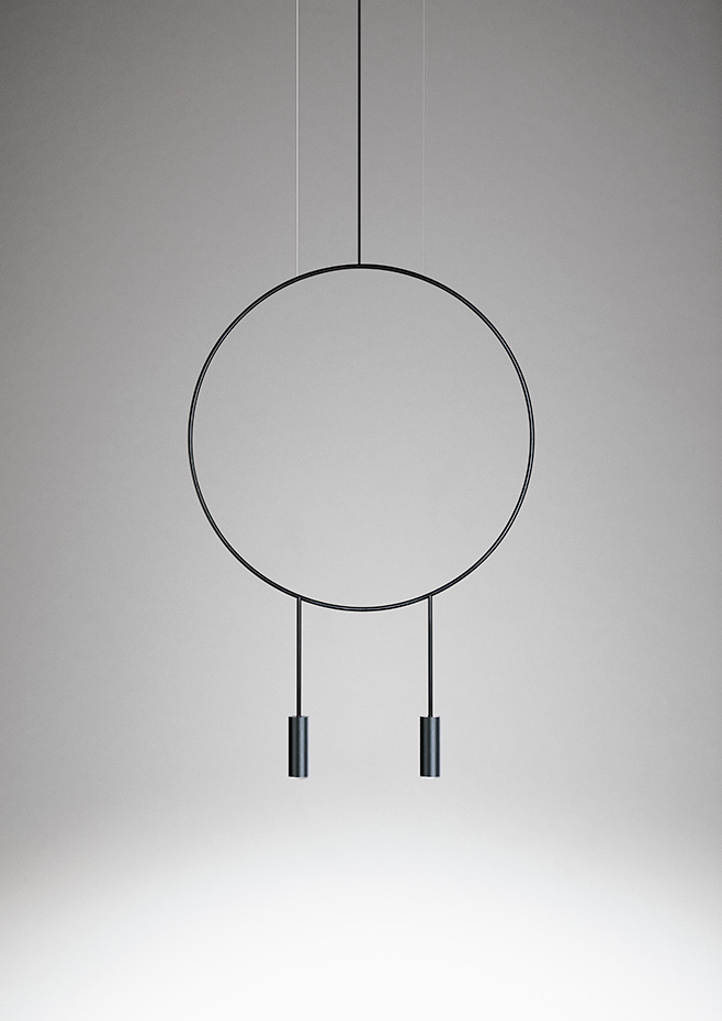 Cylindrical aluminium heads and acrylic (PMMA) lens diffusers. Adjustable height. Optional decorative sound absorbing panel.