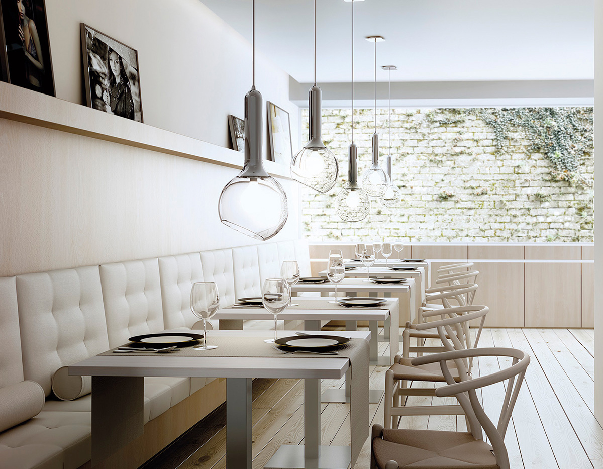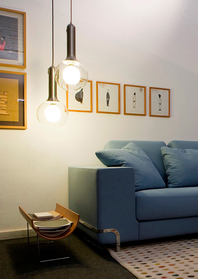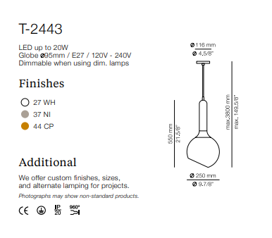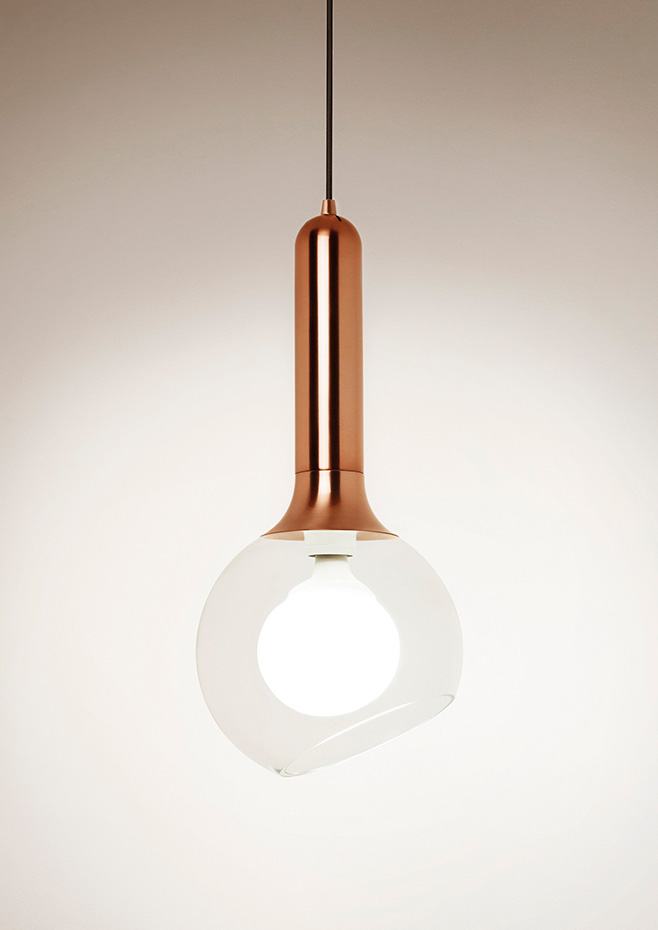 Metallic pendant with a transparent glass globe cut diagonally on the bottom and decorative bulb. Adjustable height and individual canopy, suitable for creating compositions.