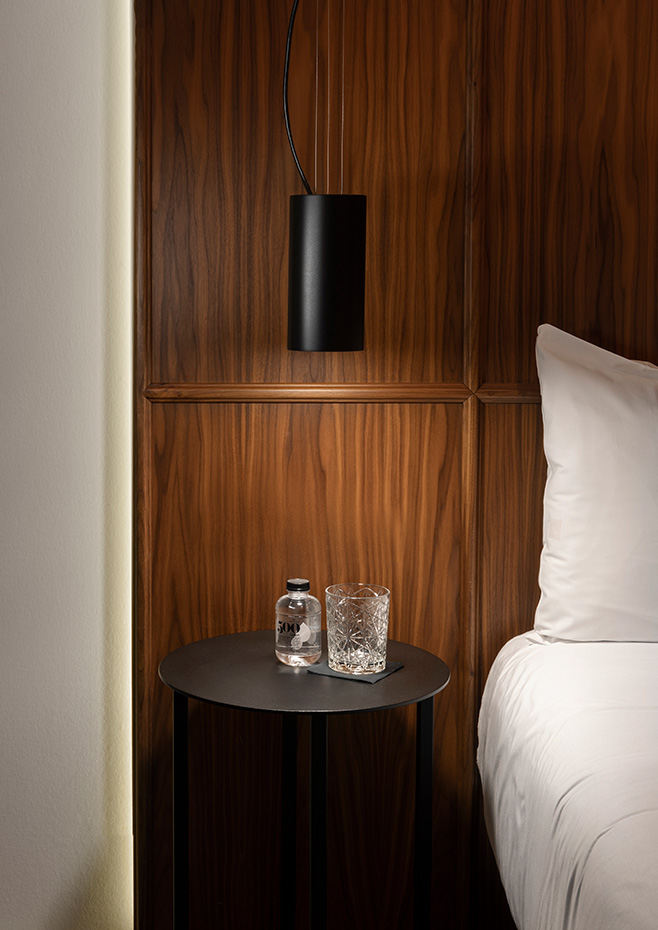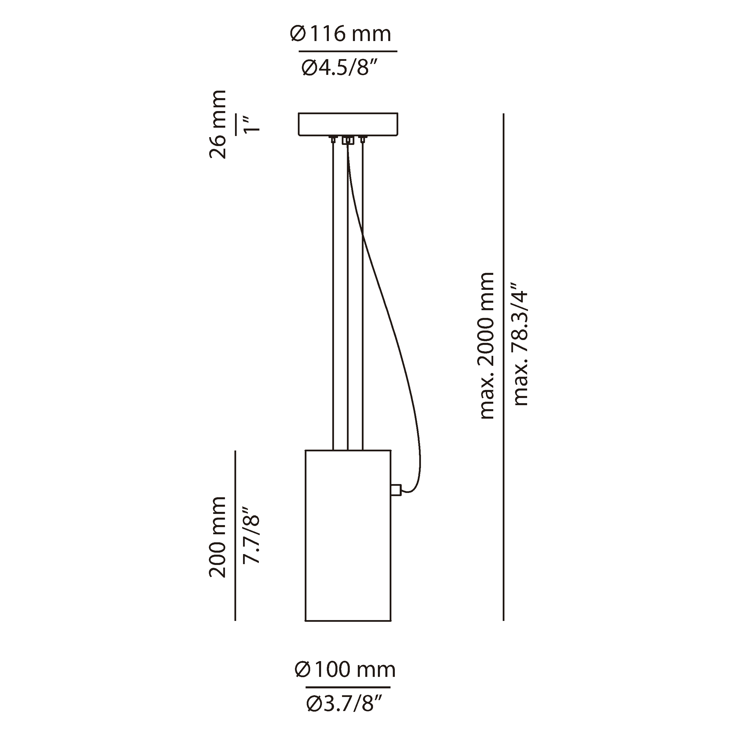 Metallic suspension lamp with cylindrical head.