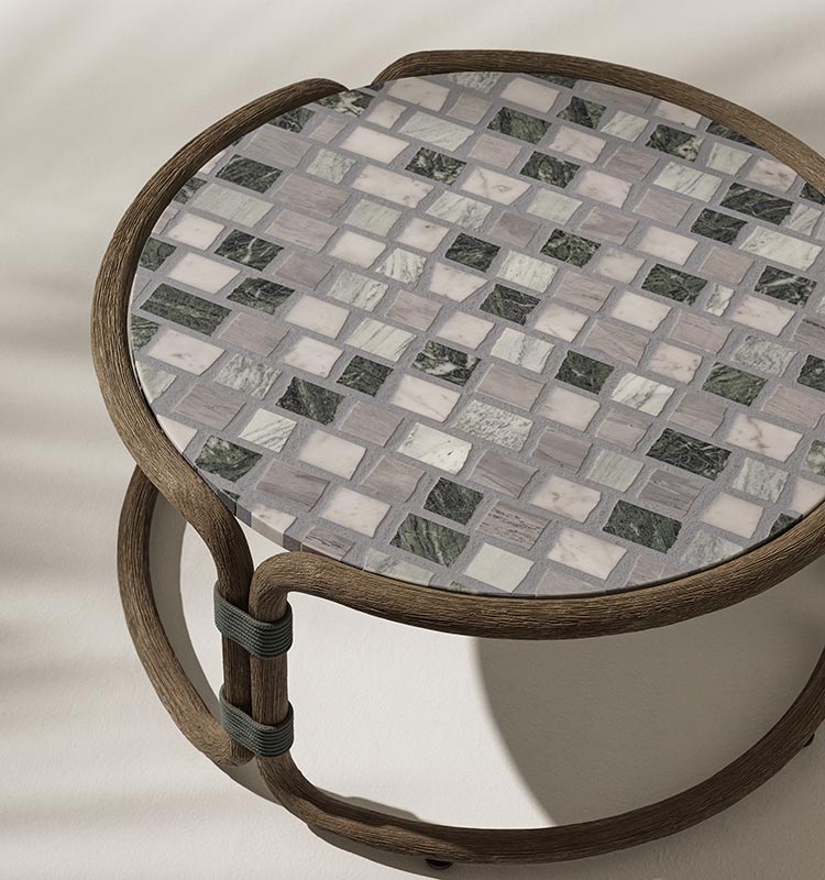 Rotin is a lounge collection where shape, colour and substance come together to tell the story of a new way of thinking and en-joying places for relaxing in company in the open air. Comprising sofa, lounge armchair, coffee table and pouf with structure in pickled teak, Rotin is inspired by Asian tradition, which sees bamboo as the main element for outdoor furnishings together with techniques normally used in the production of rattan furniture.