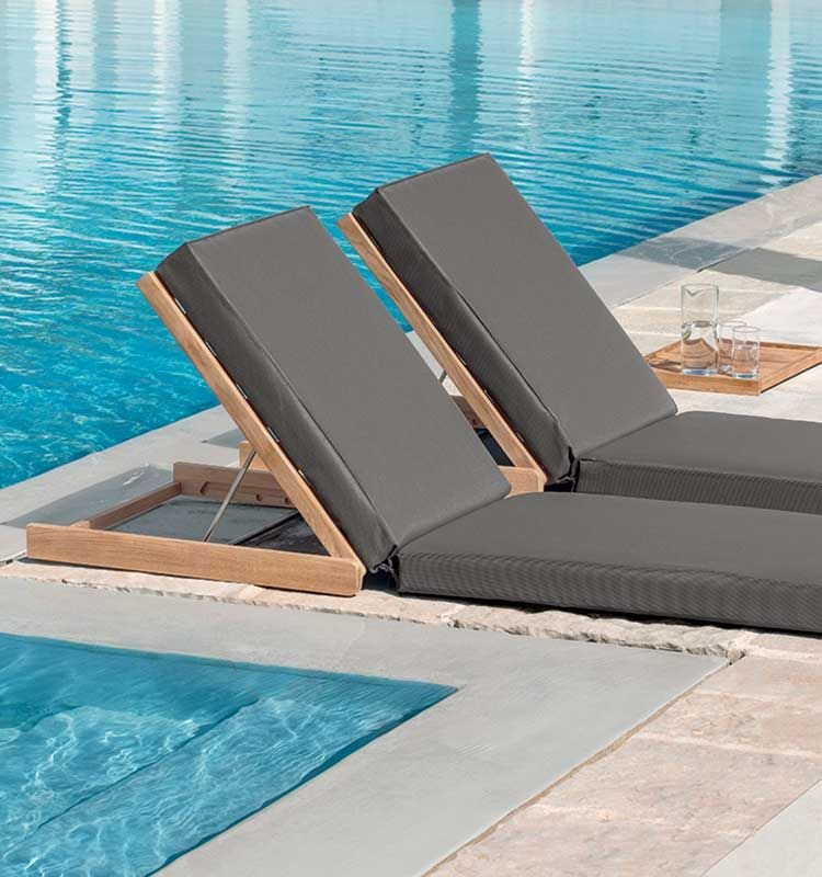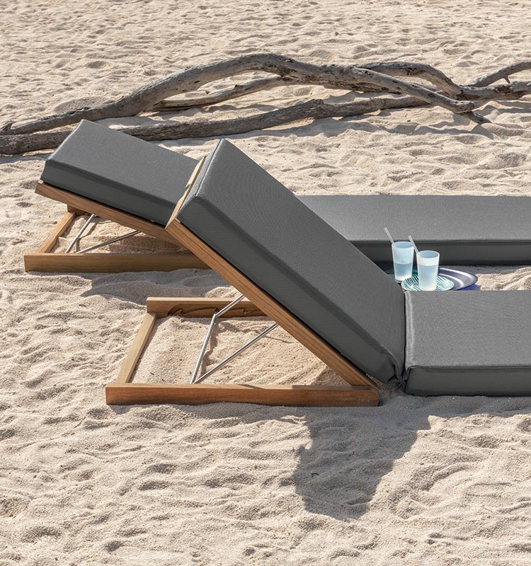 Simply comfortable and elegant, Sandy has an adjustable back in teakwood, its mattress is covered in waterproof synthetic fabric.