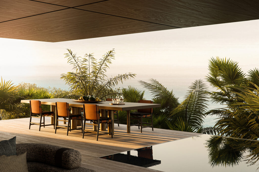 The generous geometries of 10th Joint Dining Table define the spaces of the outdoor environment.