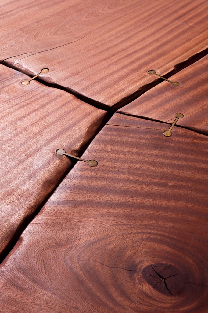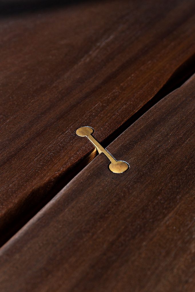The bases in burnished brass, with different diameters, follow one another asymmetrically, supporting the powerful table top.