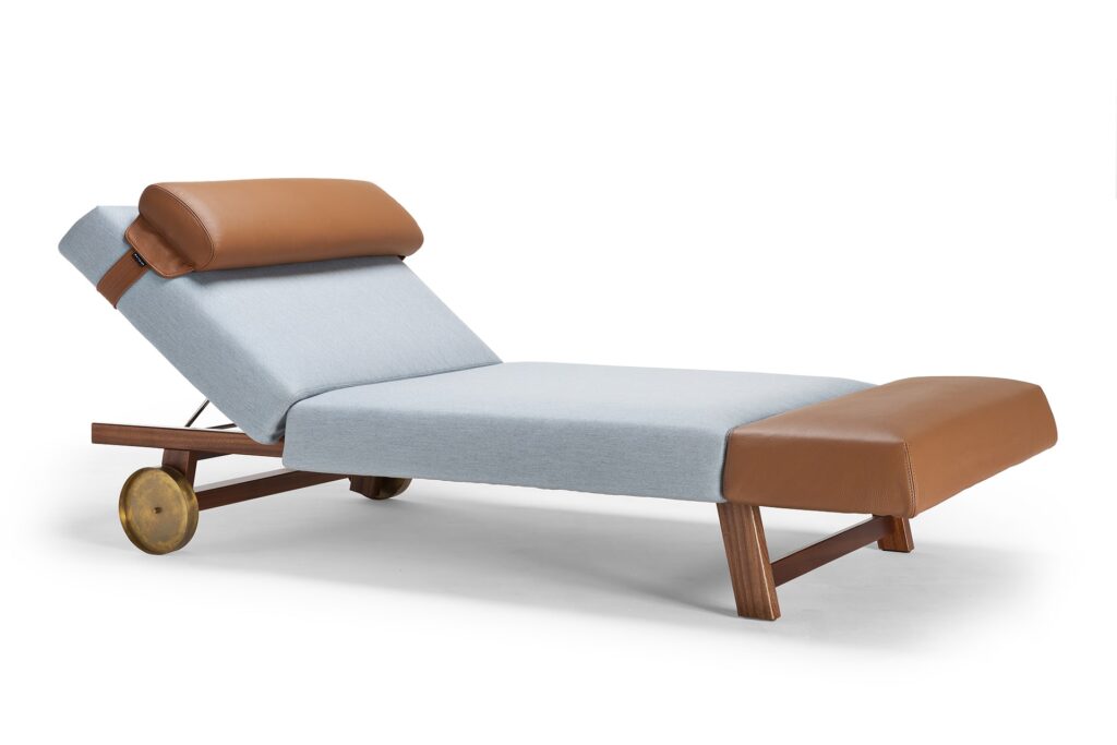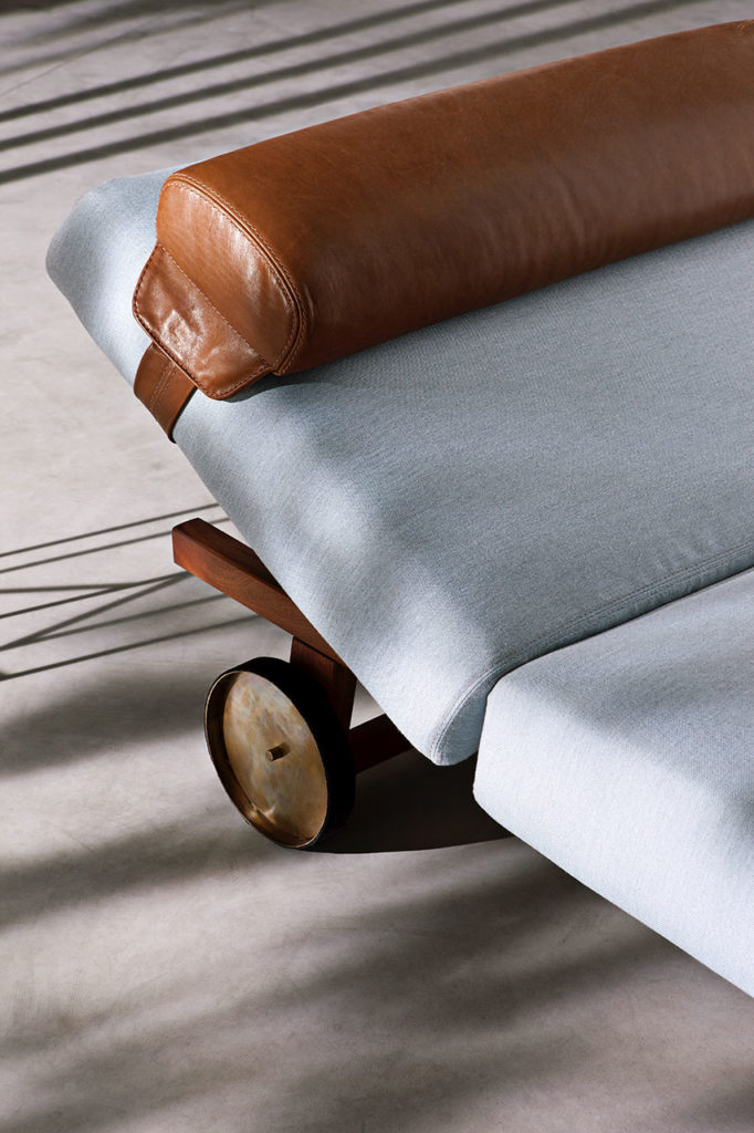 The seat, available in three soft modules, is supported by the Sapelli solid mahogany handmade frame. Equipped with burnished brass wheels that facilitate its movement, 10th Sun Longer is the sunbed that dresses every room with elegance. Available in fabric and leather for outdoor use.