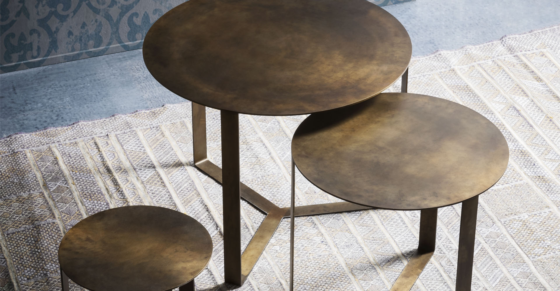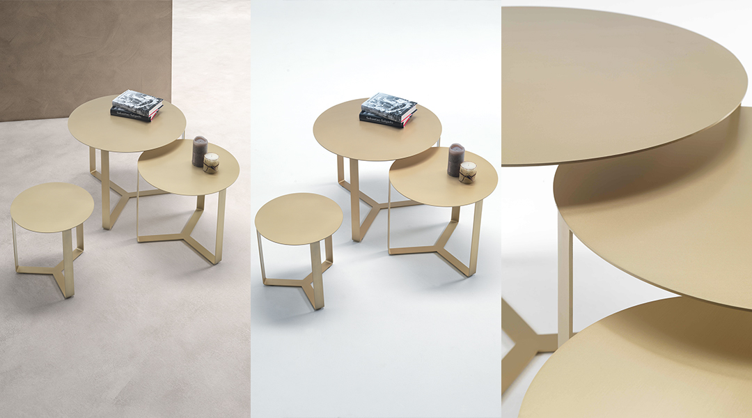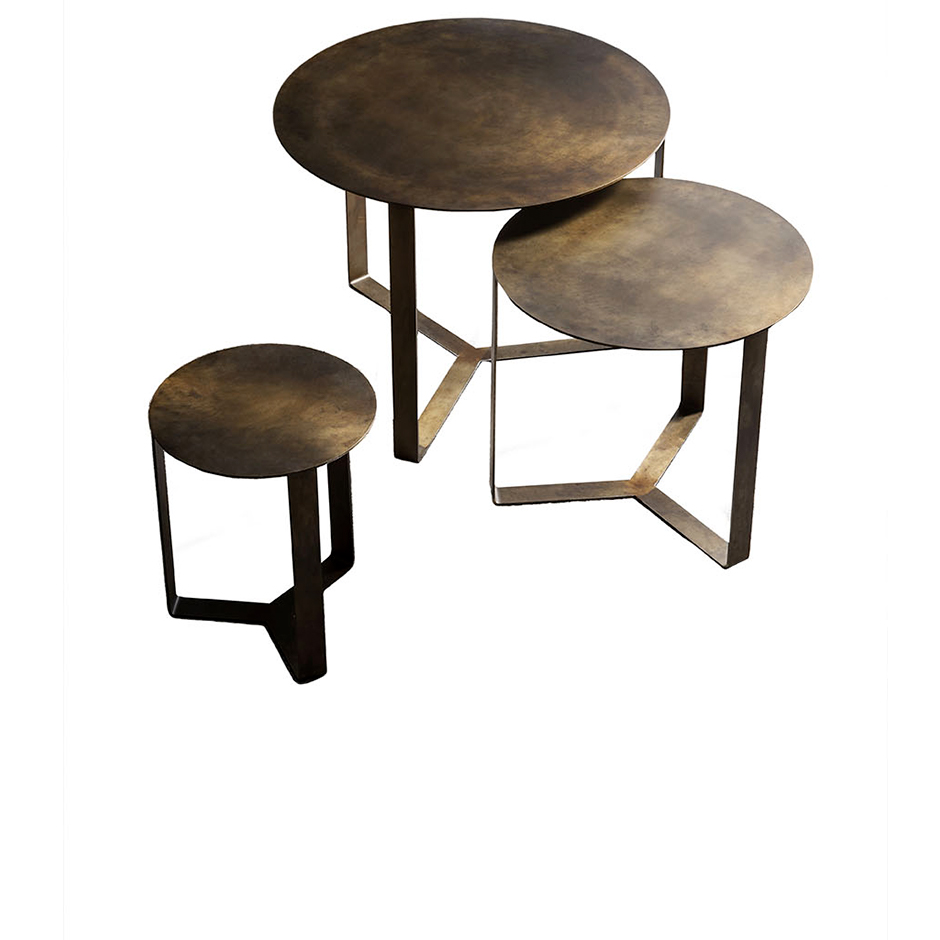 TRIS is a set of three side stackable metal tables with a round top and a base made up of three thin legs whose silhouette creates a game of solids and voids with perceptible elegance. They can also be purchased individually in the three sizes of the ?36, ?47 or ?60 top and thanks to the numerous finish variants: manual corten, burnished or bronzed or diamond or satin nickel, bronze, brass and lead, it is suitable for use in public or private spaces.