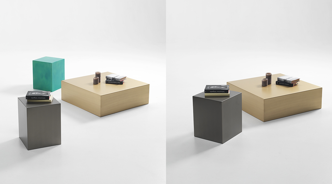 The simplicity of the cubic shape of the AL table or stool results from the meeting of the edges of a laser-cut sheet metal, in which the mirrored symmetries of satin-finish, diamond-coated or etched metallic paint come to life making it a surprisingly light element.