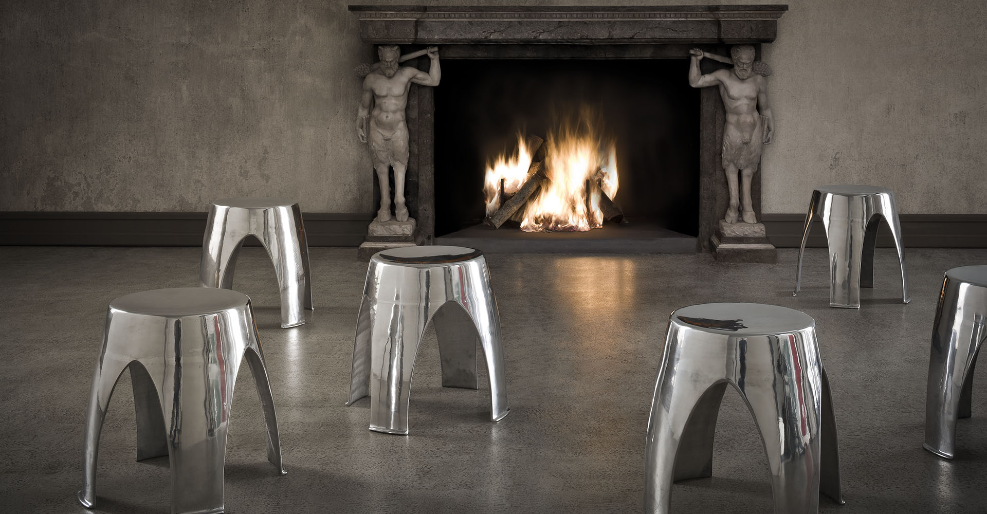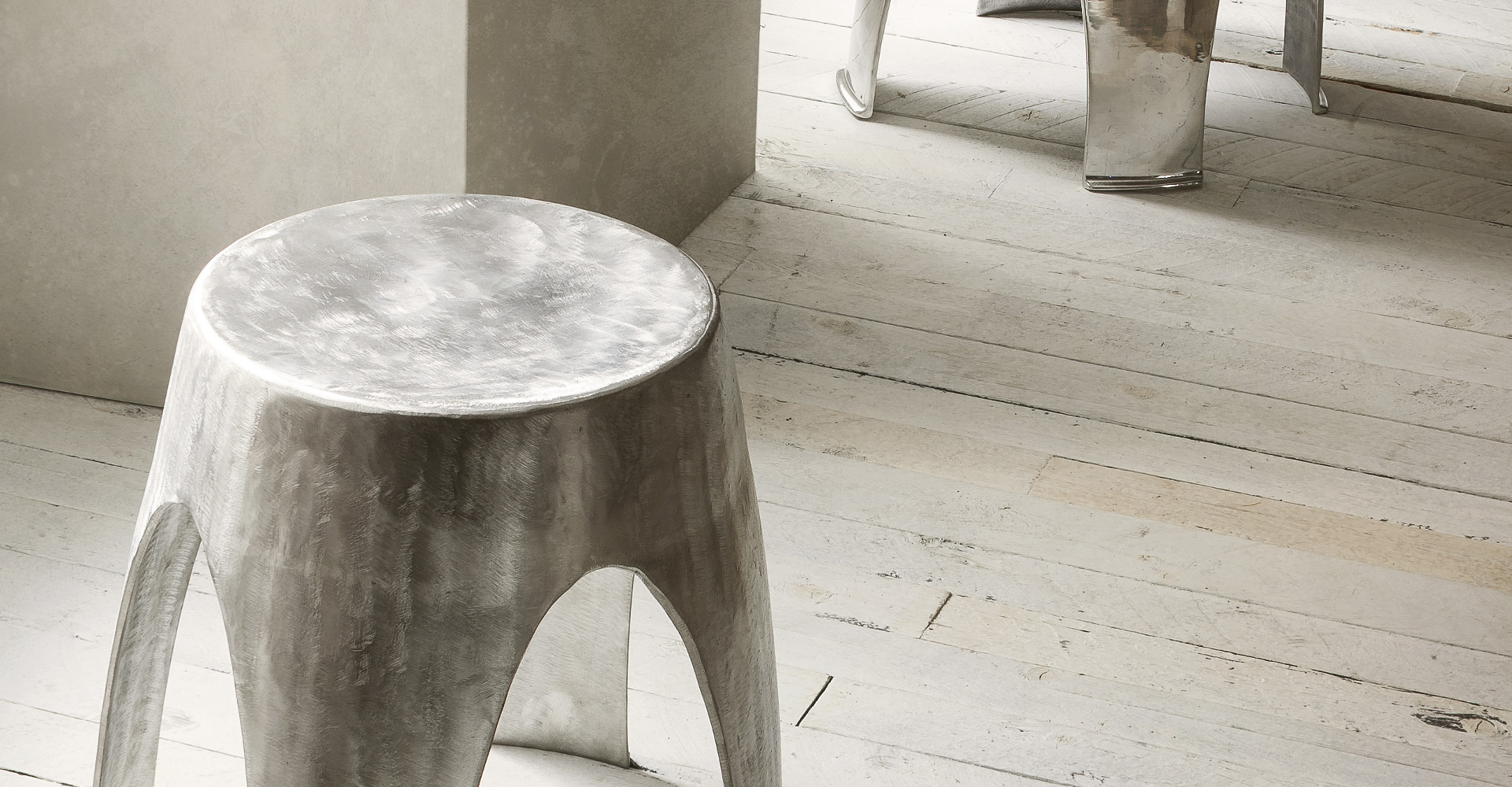 As the water flows and turns into ice, the aluminum casting can be modeled and becomes IGLOO. Reminiscing the characteristic shape of the Inuit shelters, this stool has a natural, primitive elegance. Available in polished or brushed aluminum, or in satin or diamond matalic finishes, the iconic strength of this stool completes a living or public space with personality.