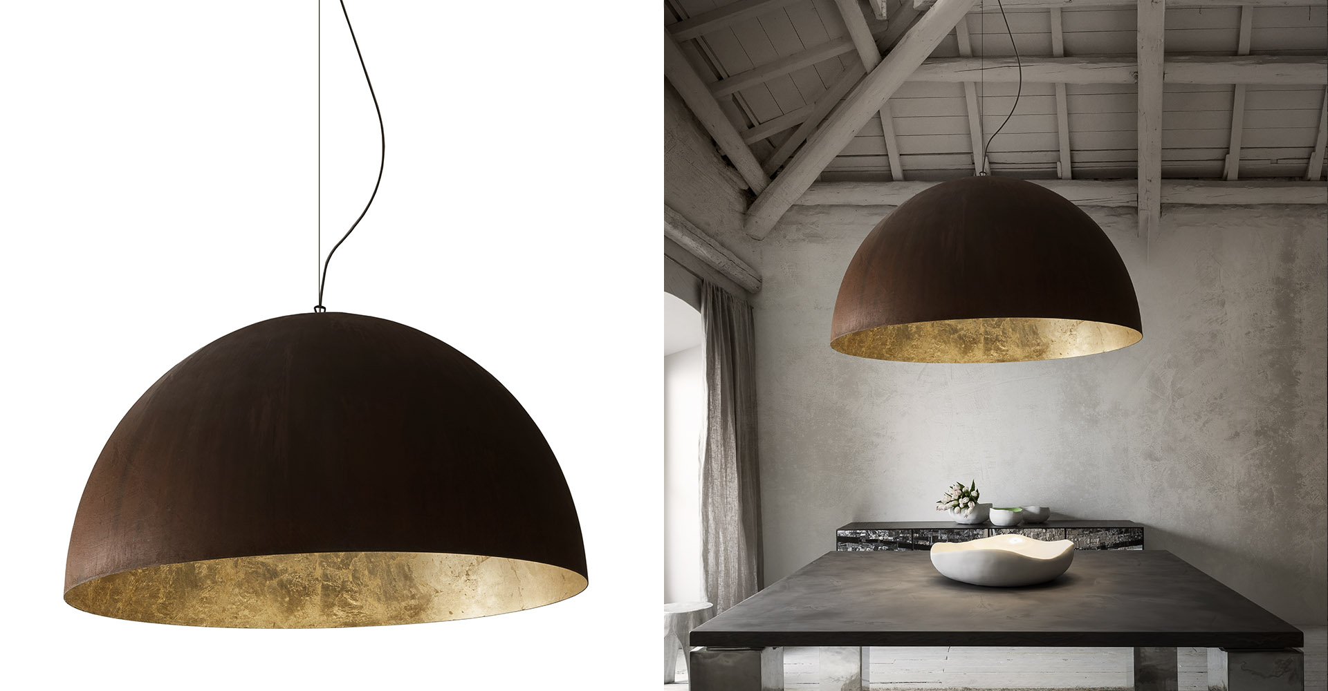 This hemispherical metal pendant lamp diffuses a soft soft light and creates a welcoming atmosphere. BALOON is available in five different sizes and numerous finishes and can therefore be used individually to light up a dining room table, or as a group over a bar counter or a kitchen. The exterior available in satin or diamond metal finishes or in corten, burnished or bronzed manual finishes and the white or gold leaf interior, create a palette of colors that can tune in or completely detach from the personality of the space in which it is inserted playing between contrasts or ton sur ton.