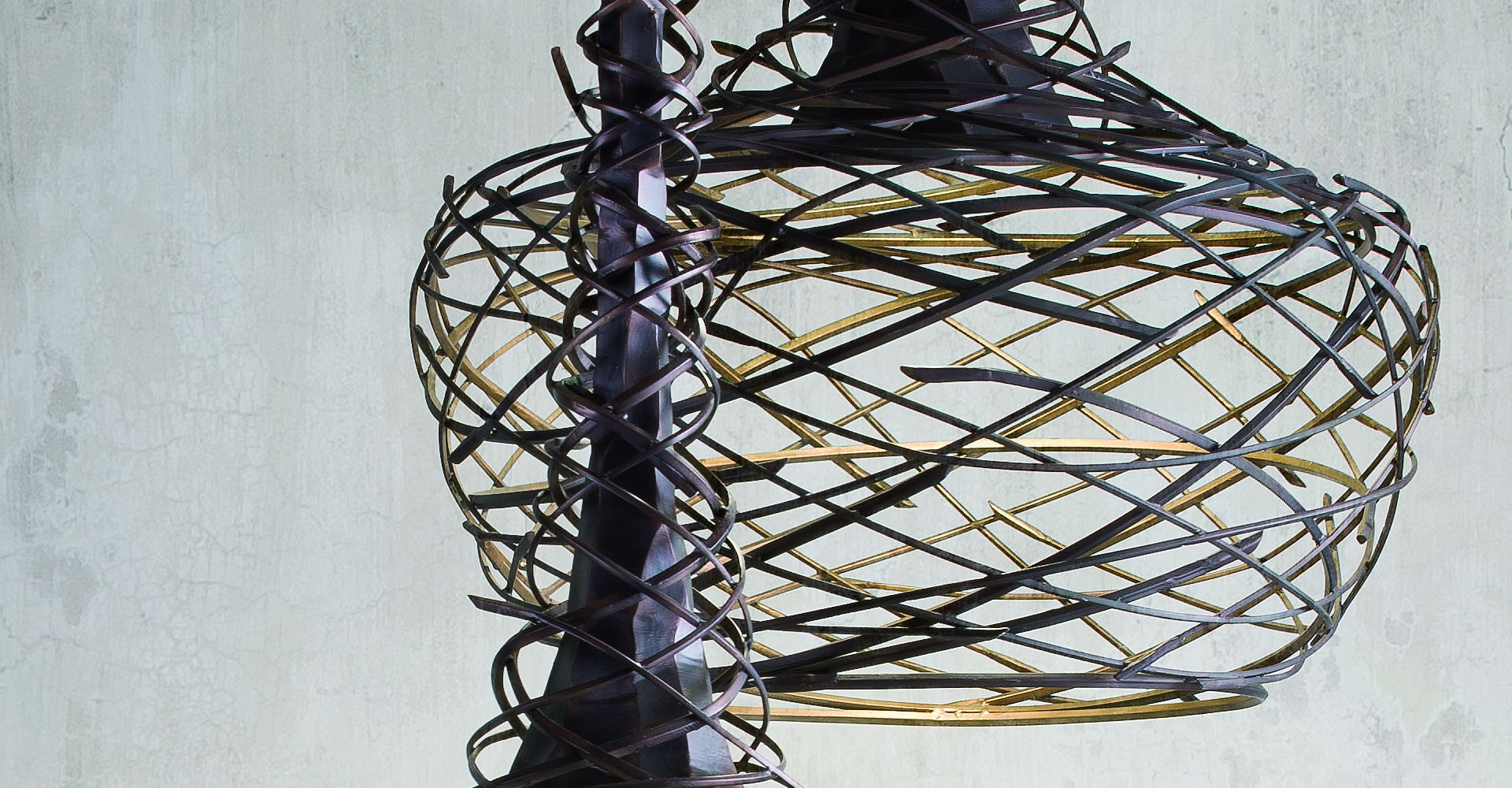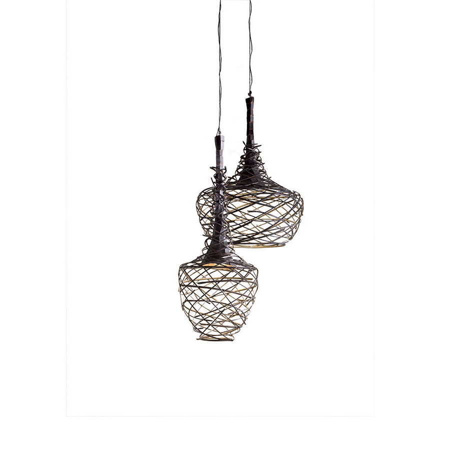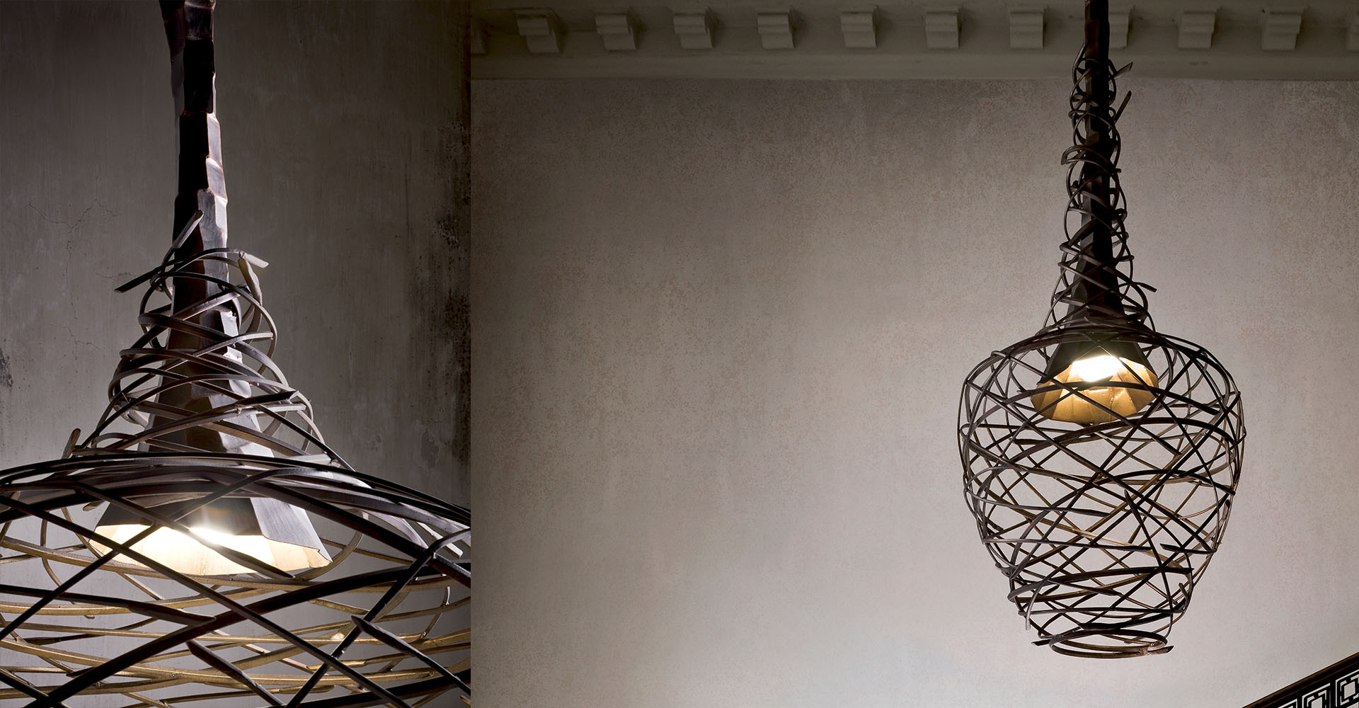 Un intreccio di tubi di ferro avvolge il vuoto illuminato dal riflesso bronzato antico. NEST è una lampada a sospensione finemente realizzata in tubolare di ferro intrecciato a mano. Una scultura, un'opera di straordinaria maestria artigiana, che ricorda la forma di una radice, in grado di far percorrere, sin dal primo sguardo, un viaggio libero e fantastico attraversando mondi e ricordi, etnie e sensazioni.