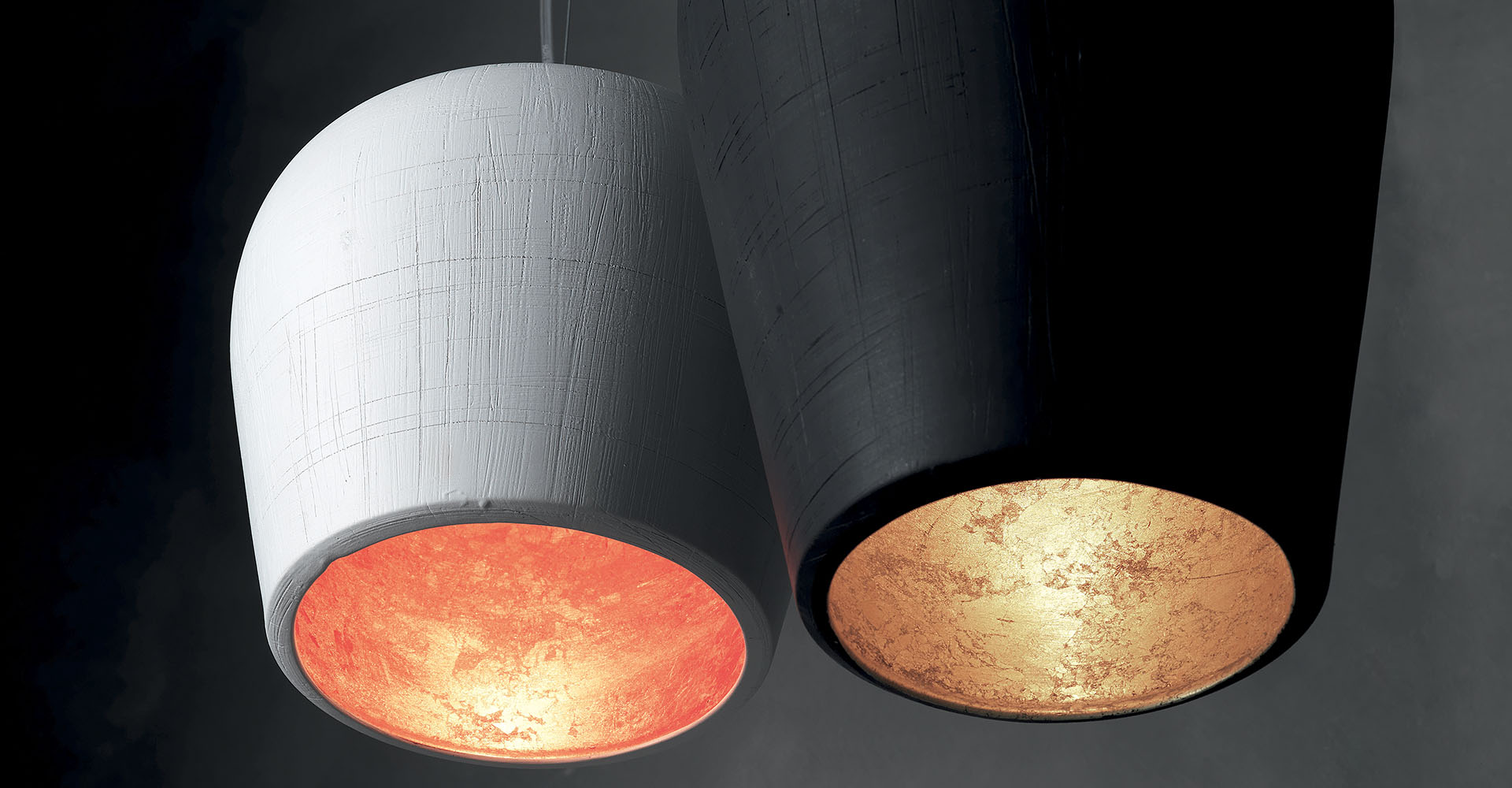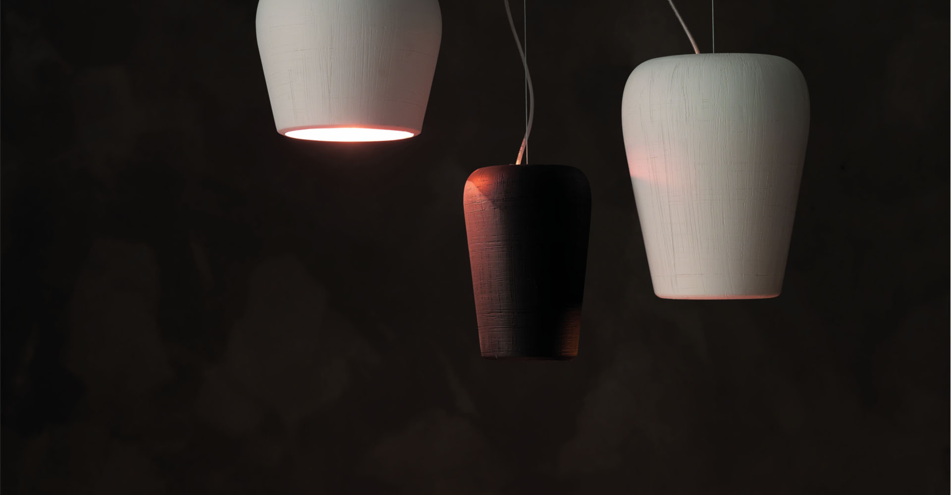 Elemento luminoso decorativo ricavato da un vaso in ceramica rovesciato e trasformato in lampadario sospeso. L'interno è disponibile bianco o foglia oro e l'esterno bianco, sabbia o cacao in tutte e tre le dimensioni esistenti. L'esterno presenta un'interessante tecnica di incisione manuale, un graffio, in contrasto con la superficie liscia della ceramica di cui è composto.LA LUN