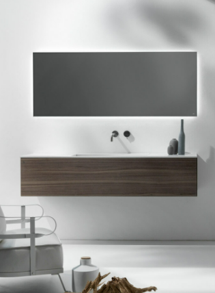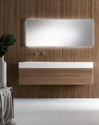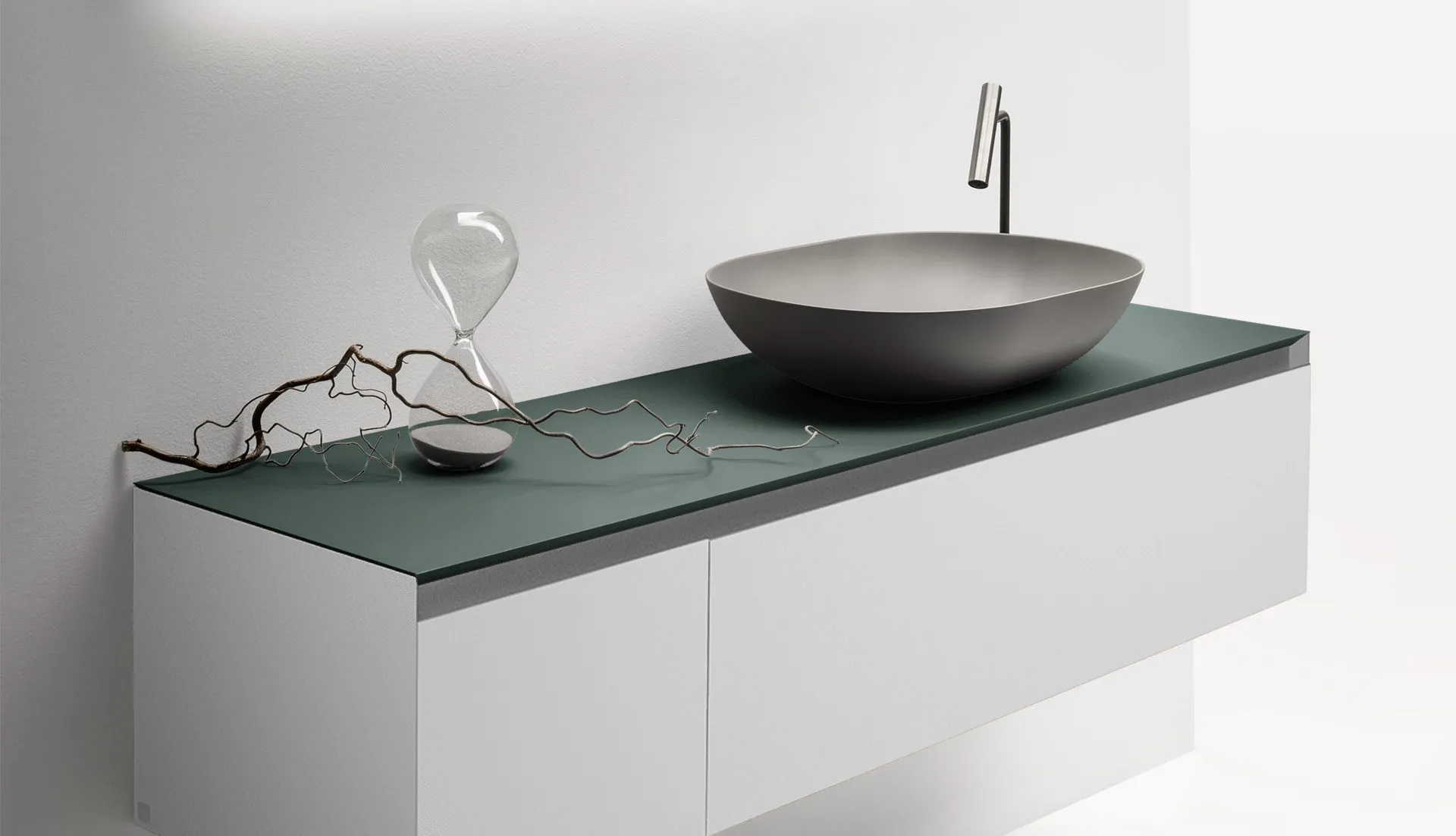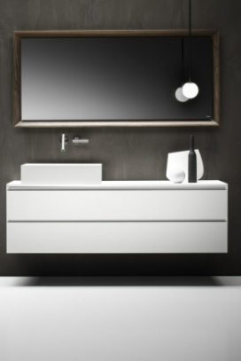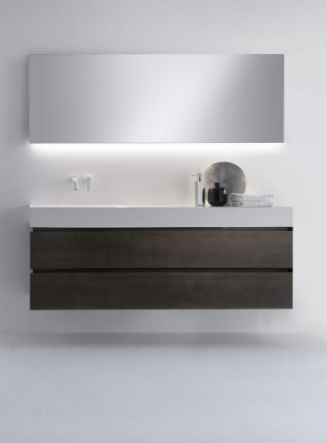 Mobile bagno porta lavabo con cassetto, top integrato e lavabo da appoggio, dimensioni da 140cm a 160cm. Piano integrato in Fenix con taglio a 45°. Lavabo in Cristalplant? Bio Active opaco modello Ciotola con copri piletta in Cristalplant? Bio Active, disponibile nelle versioni centrato, a destra e a sinistra del mobile. Basi del mobile con frontali e fianchi a 45°. I cassetti sono completamente estraibili e sono disponibili con maniglie opzionali a gola o premi apri.