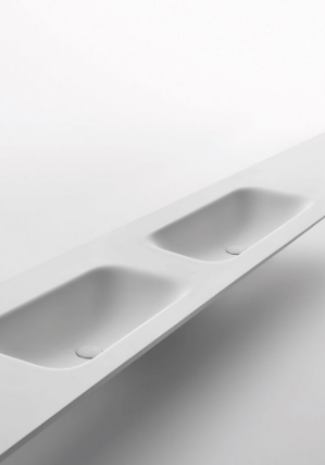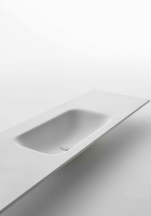 Mobile bagno porta lavabo con cassetto, top integrato e lavabo da appoggio, dimensioni da 140cm a 160cm. Piano integrato in Fenix con taglio a 45°. Lavabo in Cristalplant? Bio Active opaco modello Ciotola con copri piletta in Cristalplant? Bio Active, disponibile nelle versioni centrato, a destra e a sinistra del mobile. Basi del mobile con frontali e fianchi a 45°. I cassetti sono completamente estraibili e sono disponibili con maniglie opzionali a gola o premi apri.