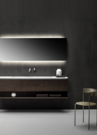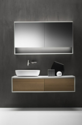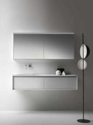 Mobile bagno porta lavabo con cassetto, top integrato e lavabo da appoggio, dimensioni da 140cm a 160cm. Piano integrato in Fenix con taglio a 45°. Lavabo in Cristalplant? Bio Active opaco modello Ciotola con copri piletta in Cristalplant? Bio Active, disponibile nelle versioni centrato, a destra e a sinistra del mobile. Basi del mobile con frontali e fianchi a 45°. I cassetti sono completamente estraibili e sono disponibili con maniglie opzionali a gola o premi apri.