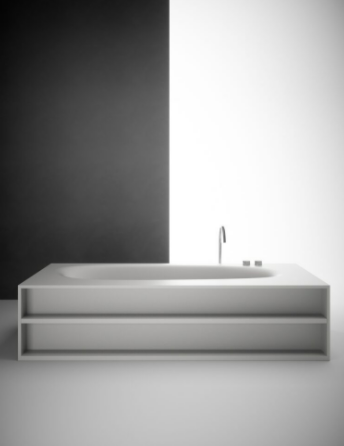 Vasca da bagno freestanding centrostanza in Cristalplant con dimensioni 174cm per 82cm. Porta salviette e bordo inferiore del basamento in metallo. Copri piletta in Cristalplant.
