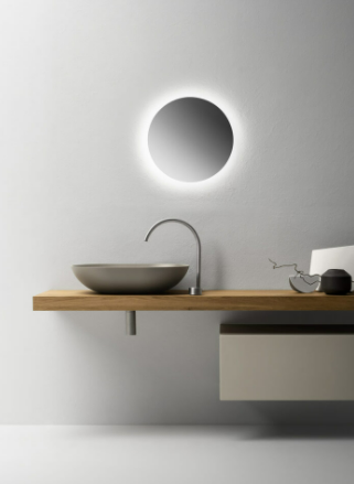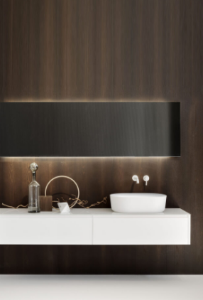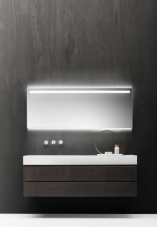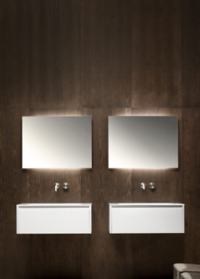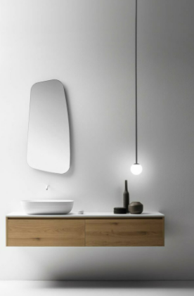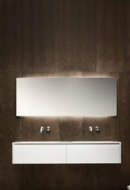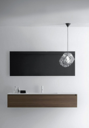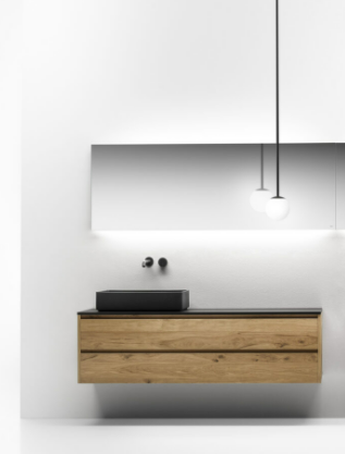 Mobile bagno porta lavabo con cassetto, top integrato e lavabo da appoggio, dimensioni da 140cm a 160cm. Piano integrato in Fenix con taglio a 45°. Lavabo in Cristalplant? Bio Active opaco modello Ciotola con copri piletta in Cristalplant? Bio Active, disponibile nelle versioni centrato, a destra e a sinistra del mobile. Basi del mobile con frontali e fianchi a 45°. I cassetti sono completamente estraibili e sono disponibili con maniglie opzionali a gola o premi apri.