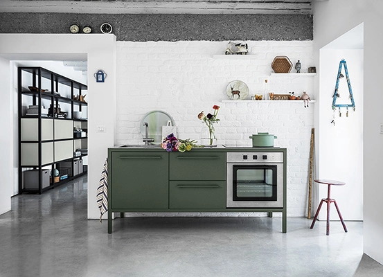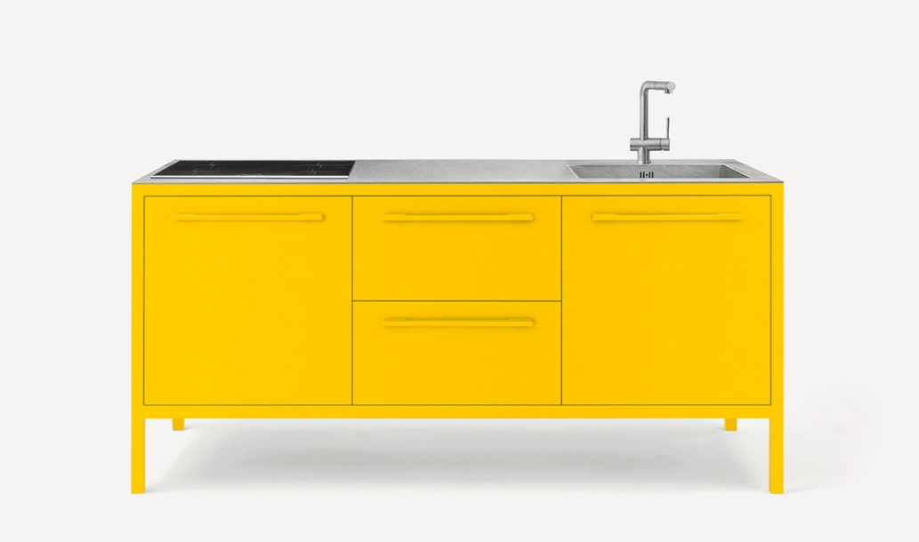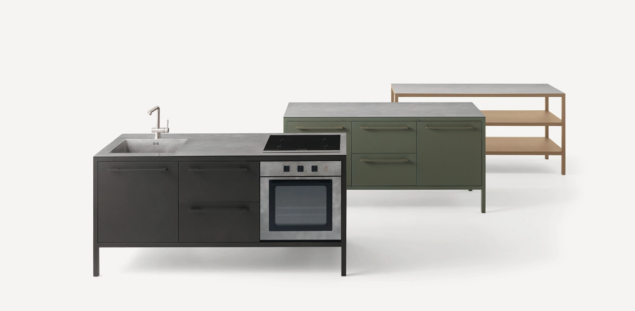 Le cucine Frame sono proposte a 2 o 3 moduli, con top in acciaio Barazza o in Fenix NTM. L’acciaio – in finitura Vintage o satinata da 4 mm – è abbinabile con tutte le finiture Fantin, mentre i top in Fenix NTM sono proposti con telai nelle finiture Ultra-matt perché esattamente corrispondenti per colore, opacità e morbidezza al tatto. è così possibile ottenere cucine monocromatiche dalle solide strutture in metallo Fantin e con top resistenti e ripristinabili.