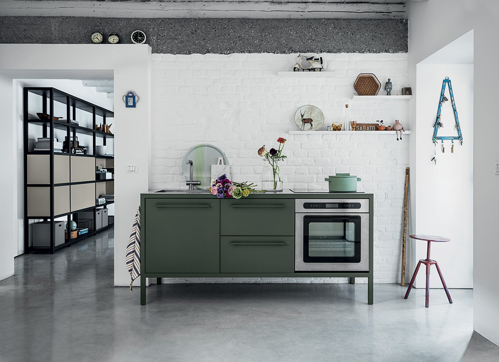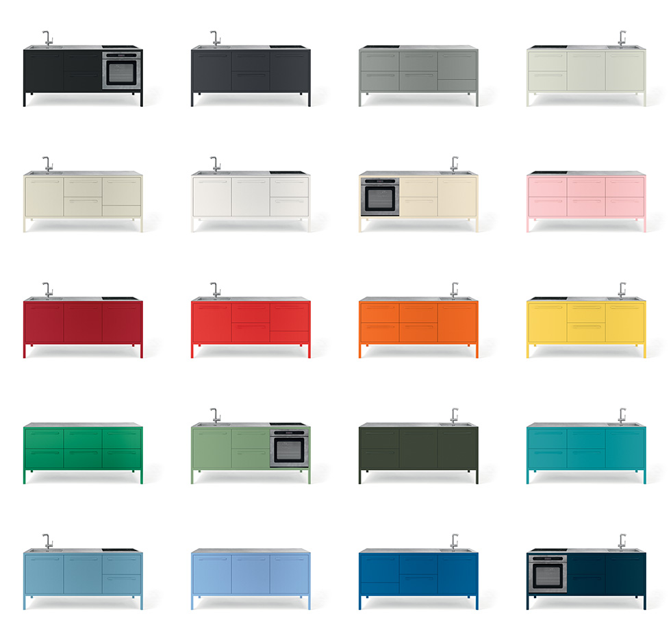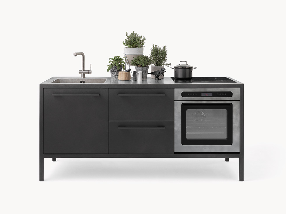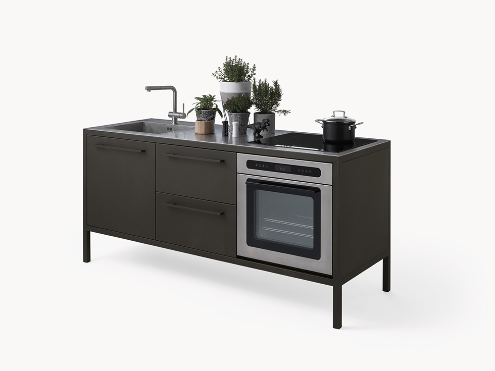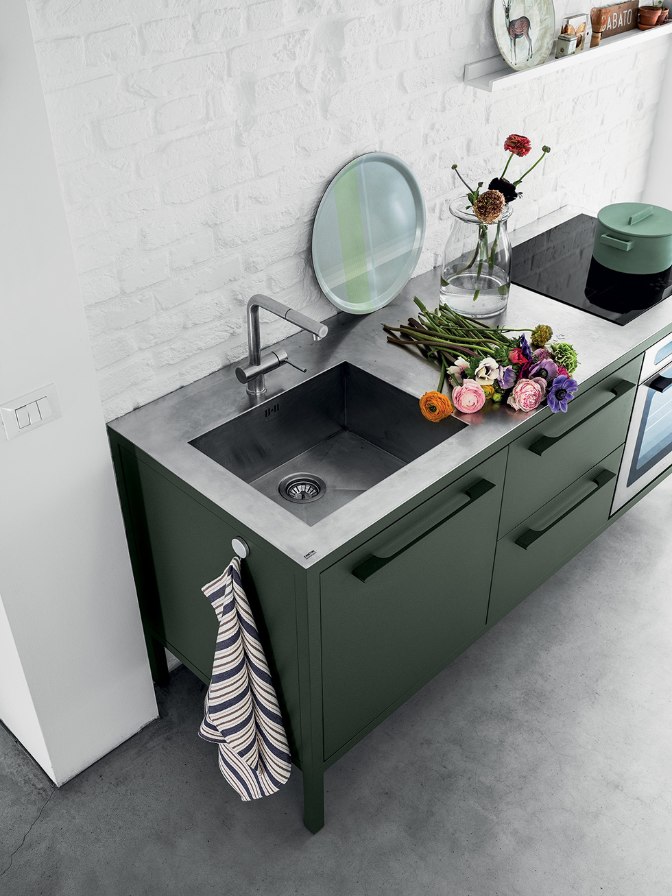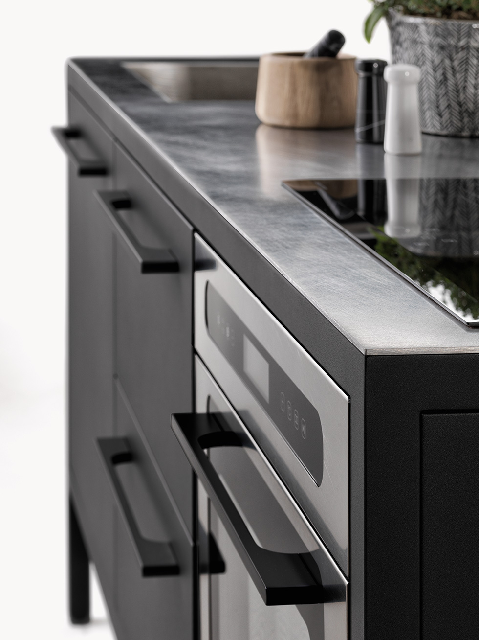 Le cucine Frame sono proposte a 2 o 3 moduli, con top in acciaio Barazza o in Fenix NTM. L’acciaio – in finitura Vintage o satinata da 4 mm – è abbinabile con tutte le finiture Fantin, mentre i top in Fenix NTM sono proposti con telai nelle finiture Ultra-matt perché esattamente corrispondenti per colore, opacità e morbidezza al tatto. è così possibile ottenere cucine monocromatiche dalle solide strutture in metallo Fantin e con top resistenti e ripristinabili.