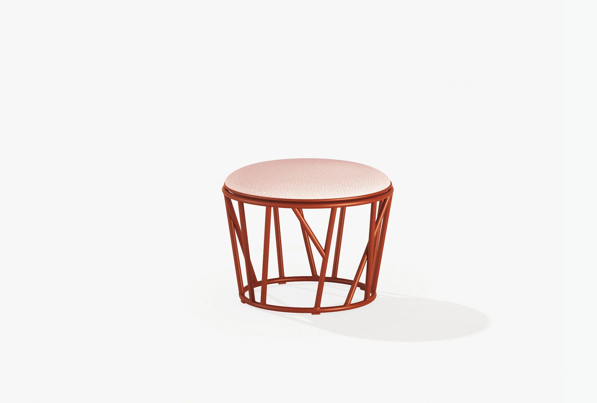 A name that brings to mind savannas and untouched nature: the structure of the Wild collection recalls the patterns of intertwined branches in the midst of a thick forest. This collection of dining tables, low tables and poufs maintains great formal and stylistic coherency, bringing an exotic touch to any room. The painted aluminium makes these tables and poufs resistant to wind, rain and colour fading caused by the sun. The removable cushions add comfort at the same time as providing practicality.