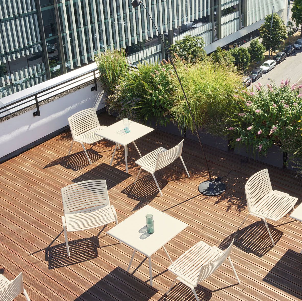 The encounter between the solidity of the material and the light weight of the shapes. In the Zebra collection, the die cast aluminium is structured by removal, which with a game of blocks and voids, illuminated by the sun, designs mesmerising geometric shapes on the ground. For even greater comfort, cushions are available for the seat and backrest, covered with fabrics which are suitable for outdoor use: resistant to water, to stains, to UV rays, and to abrasions.