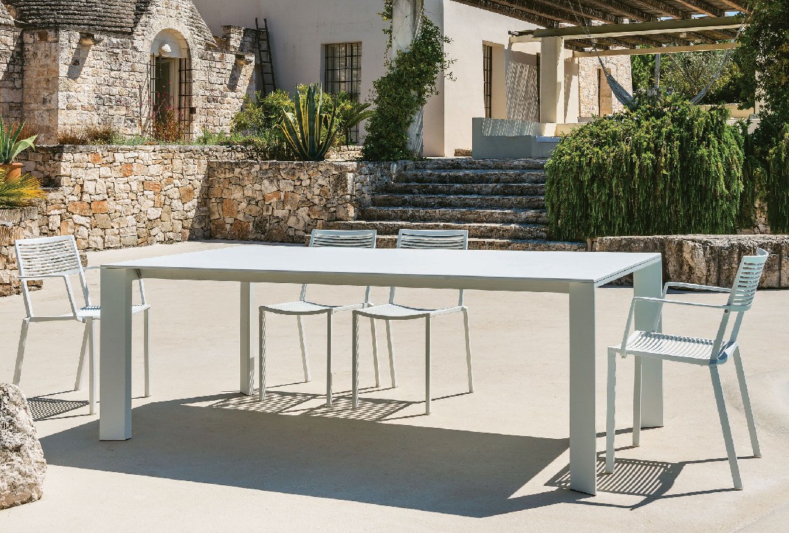 The Grande Arche collection comprises: fixed garden table and extendable garden table with top in aluminium or speckled aluminium, bench.