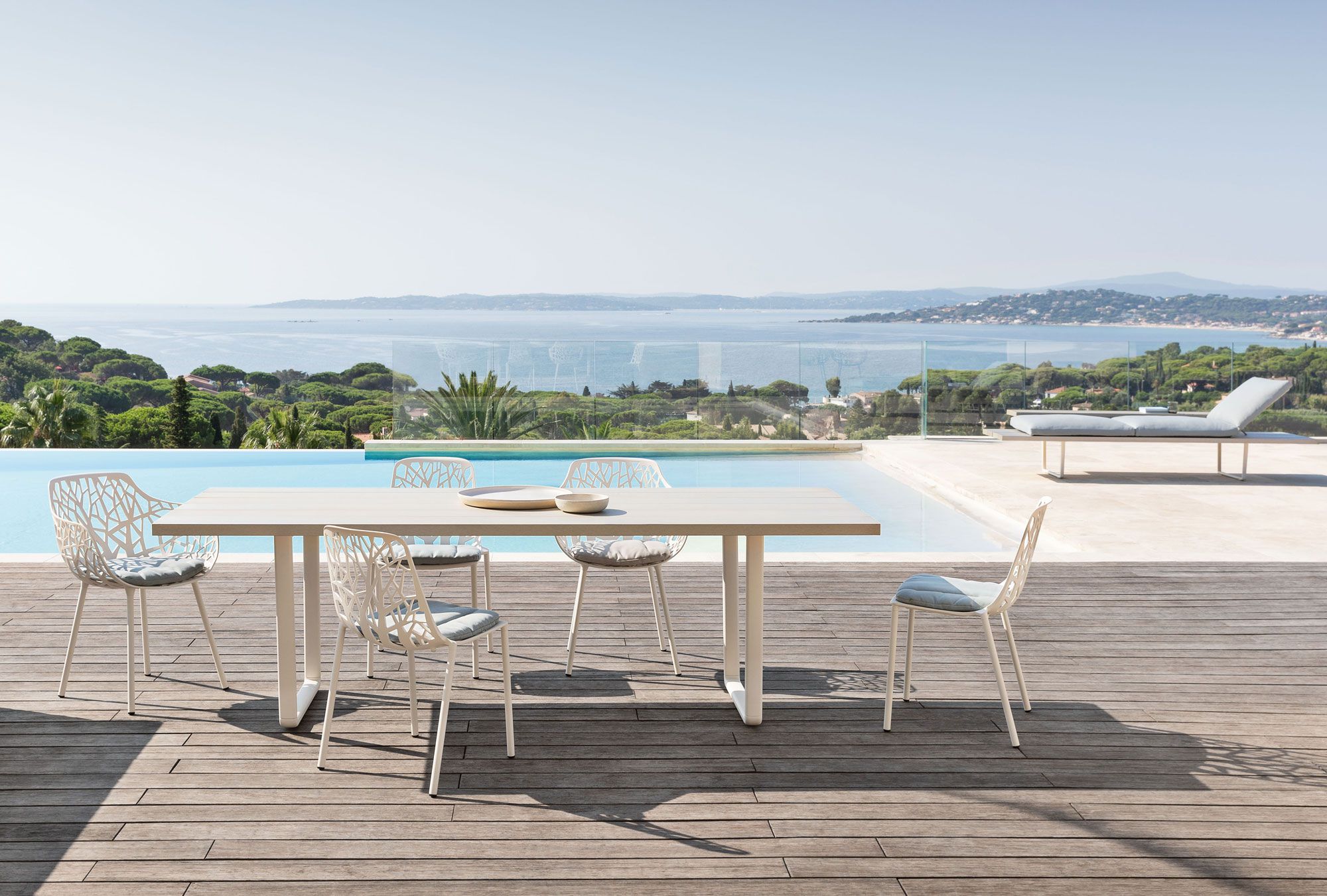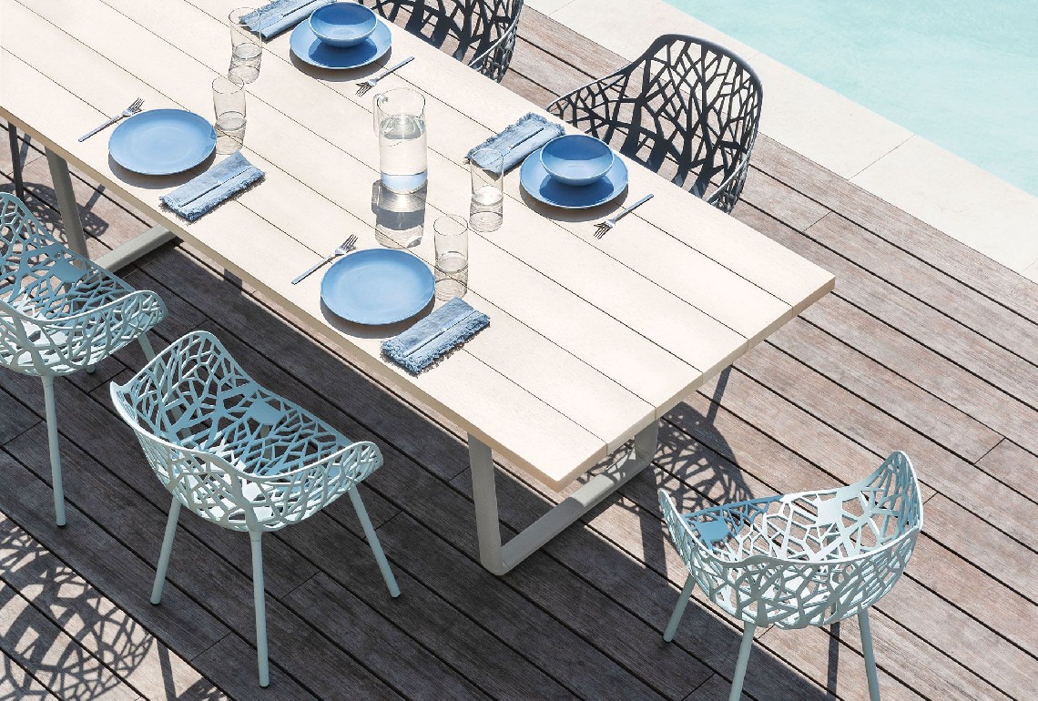 The Orizon collection includes: dining tables, low tables, benches, sofas and chaise-lounge.