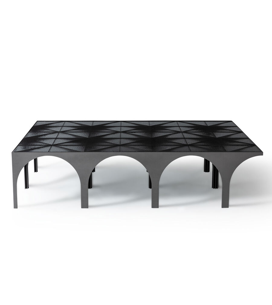 Arches of solids and void alternate with pleasing regularity in the legs of the Metropolis coffee table, made entirely in steel in a choice of elegant finishes. The visually light top in coloured glass combines to create an almost sculptural effect in this innovative piece by Atelier O?. Available in three formats, it brings a touch of urban chic to spaces ranging from the entrance way to the living room.