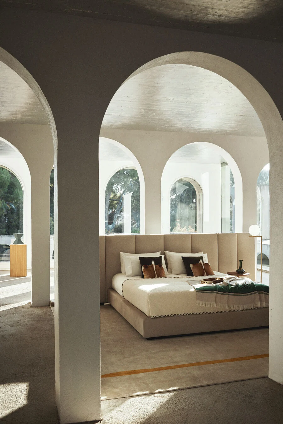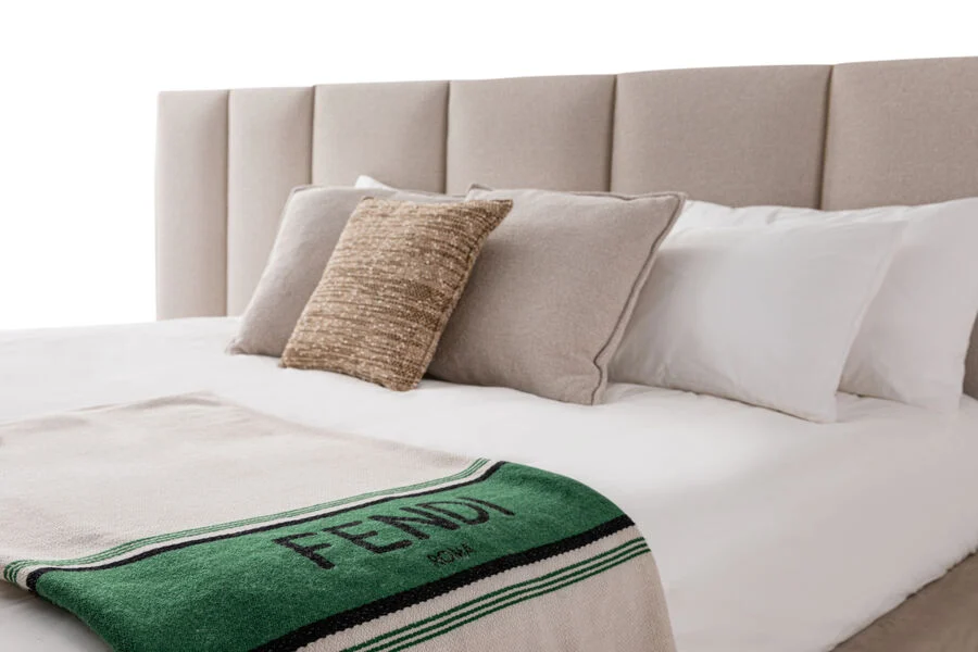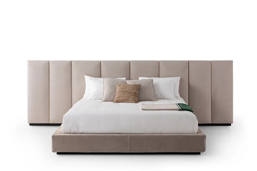 With its spectacular oversize headboard, the Delano double bed brings a new dimension to the bedroom. Its soft upholstery in a choice of fabric or leather creates a comfortable, welcoming support that is conducive to rest and relaxation, while the frame in maple wood with steel contours makes for a striking visual contrast. Available in a variety of models, designed to fit any space.