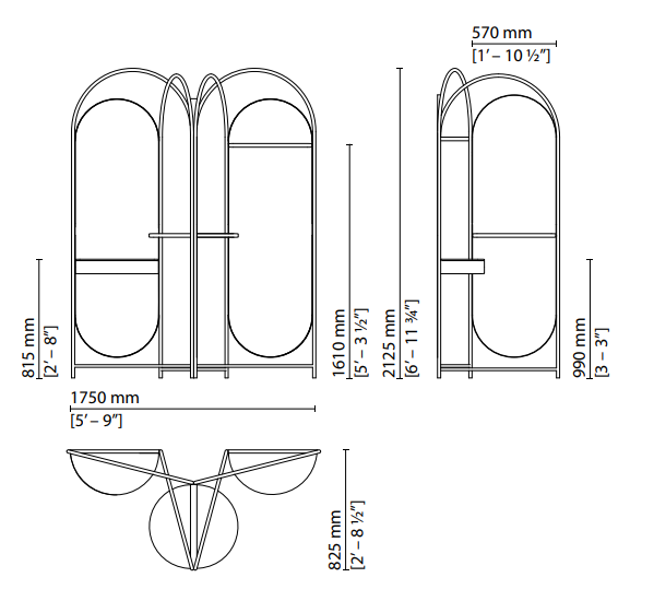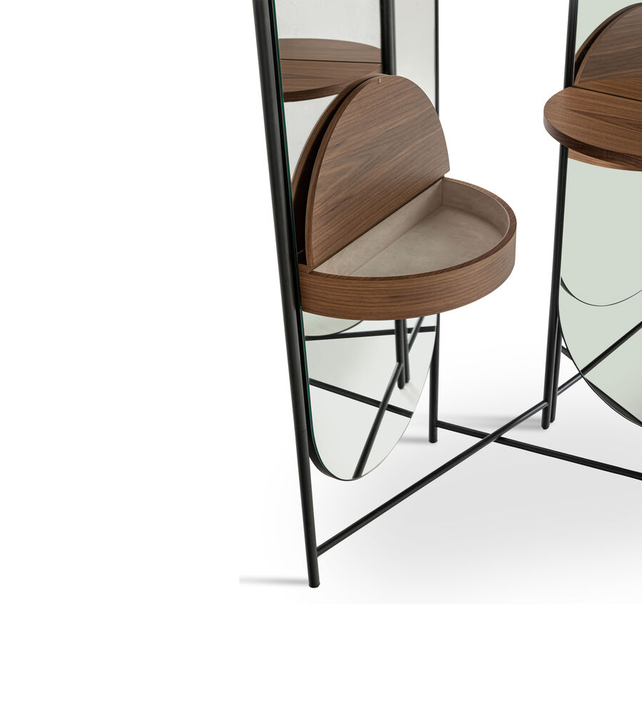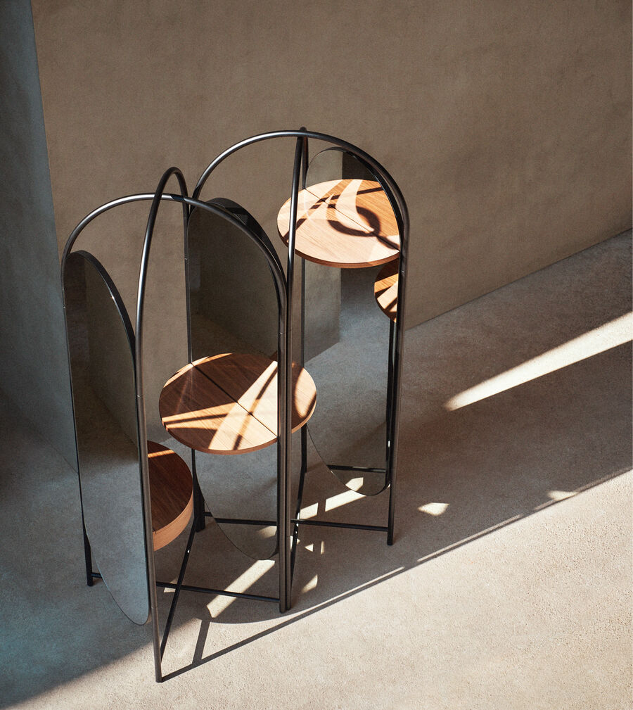 Harmonious forms and lightweight materials combine in an elegant interplay of mirrors and arches in brushed steel. Designed by Atelier O?, the Blossom screen sits upon rotating castors for easy movement. It can be fitted with a series of shelves and a storage bin in a choice of American walnut and grey-stained or matt lacquered oak. The result is a fascinating balance of architectural elements that offer an intriguing new interpretation of light and living space.