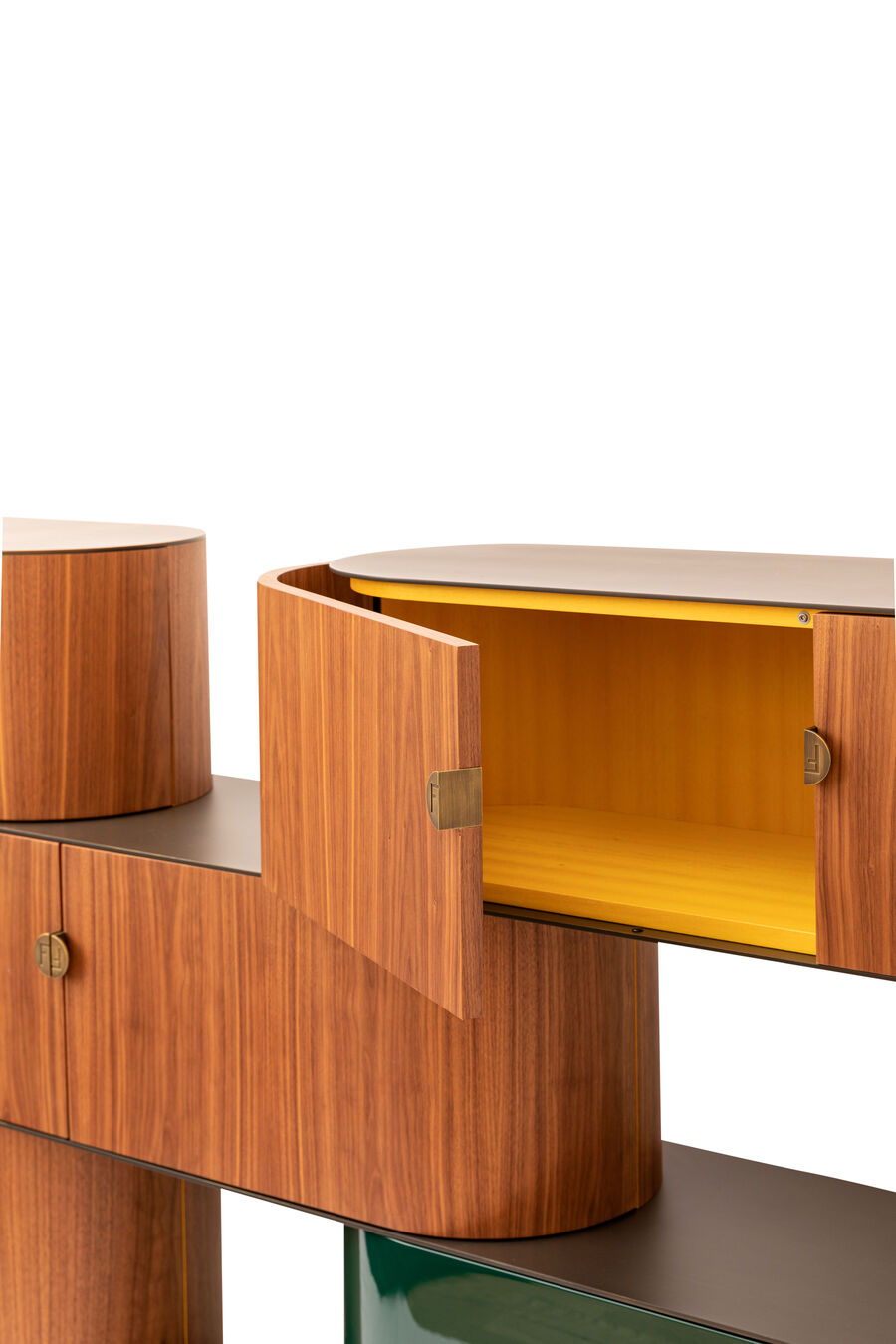 The Maglia sideboard combines wood and metal in a composition of shelves and asymmetrical two-door drawers. The curved wooden drawers are distributed on steel-sheet shelves in a modular harmony of solids and voids that can be assembled to respond to different needs in a home setting. Available in a choice of 4 and 5 modules, it can be customised with contrasting finishes and handles with the FF logo to accent each of the individual elements.