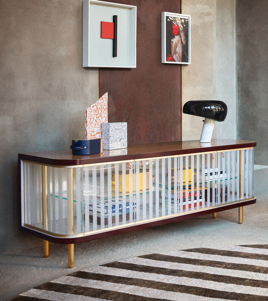 With its distinctive fluted panels in Pequin-effect sandblasted glass and lacquered wood details, the Vittoria sideboard is an original take on retro style. The top is available in a choice of natural oak, American walnut and sycamore frisé. The matt-finished metal elements and base combine with the internal wooden frame, transparent glass shelves and leather handles in a harmonious tactile contrast.