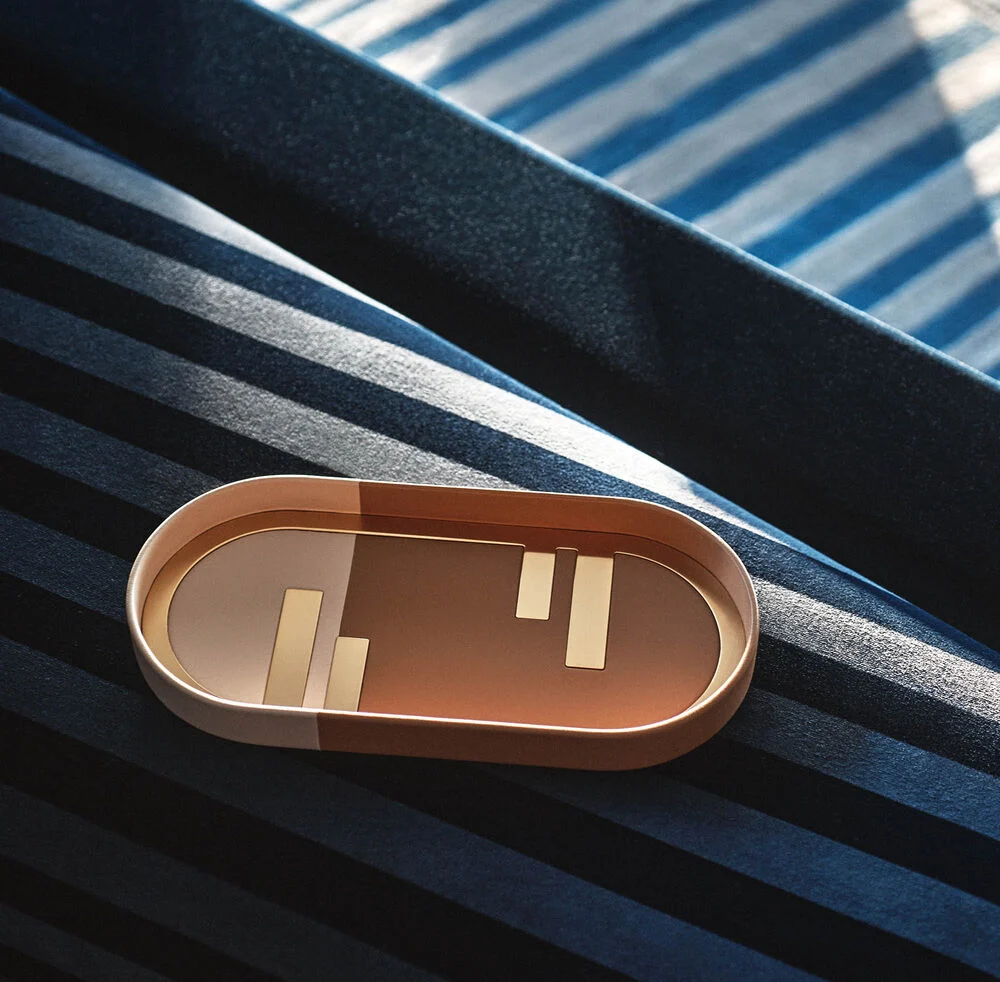 Inspired by the jewellery collection designed by Delfina Delettrez Fendi, the Fendi O’Lock tray is crafted in a selection of diverse and beautiful materials. Available in a choice of soft bicoloured block-effect leather, elegant marble or wood with inlaid Pequin stripes, each piece is finished with an iconic FF metal embellishment. Its compact dimensions make it the ideal solution for an entranceway valet tray.
