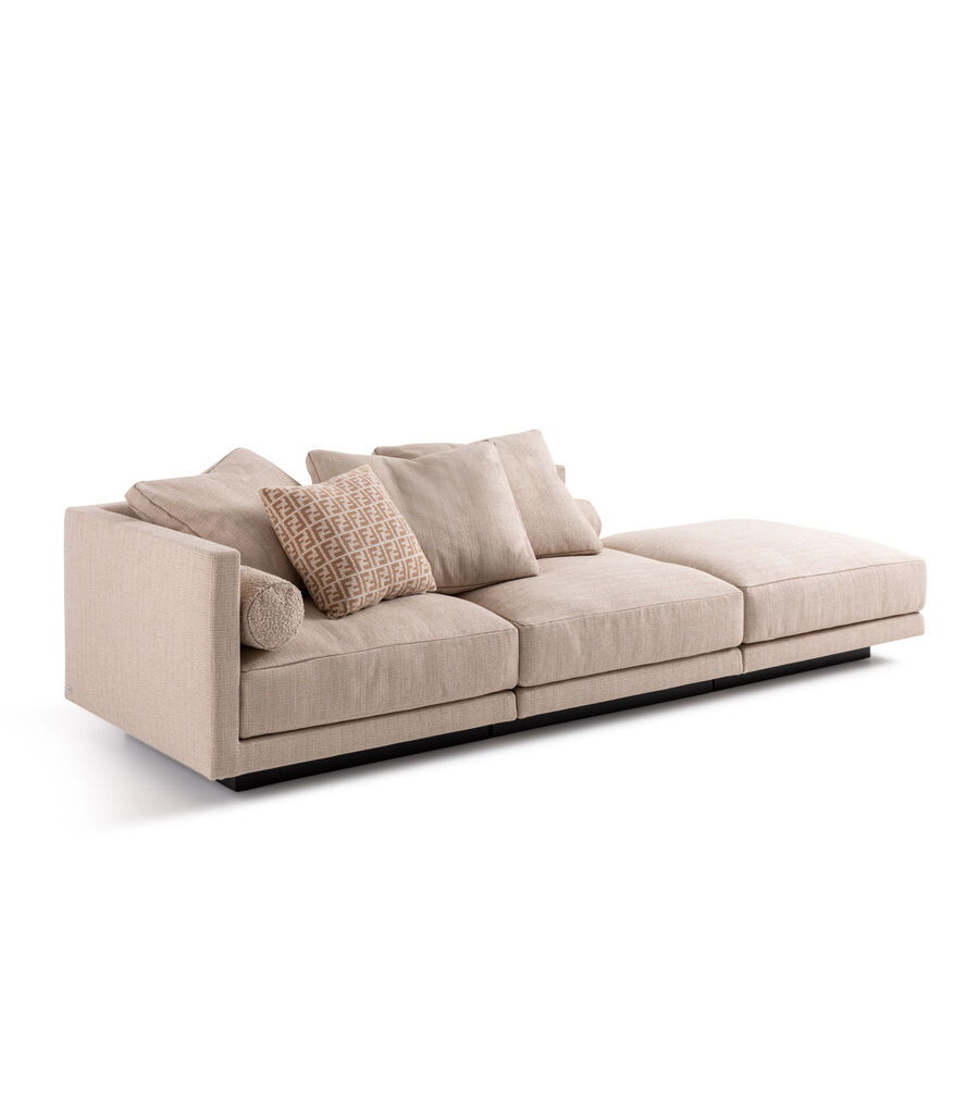 The Taiko sofa, designed by Piero Lissoni, stands out for its generous volumes and deep, comfortable seating. Exuding personality, the piece has a linear, lightweight expression, underpinned by a modular design that will easily fit multiple landscapes. Refined finishing touches nod to Fendi's iconic leather craftsmanship – notice the interlaced micro-piping and FF motifs. Customisable cushions complete the design, giving life to a personal and luxurious concept of contemporary living.