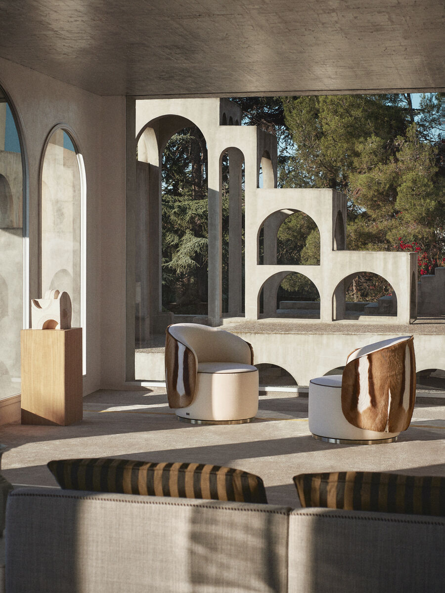 The Annabelle armchair combines a rounded back in brushed metal with a swivel base and a cocooning design that fosters conversation and relaxation. Its audacious yet harmonious form features upholstery in a palette of neutral tones, including a gazelle option for a truly exclusive addition to your living room.