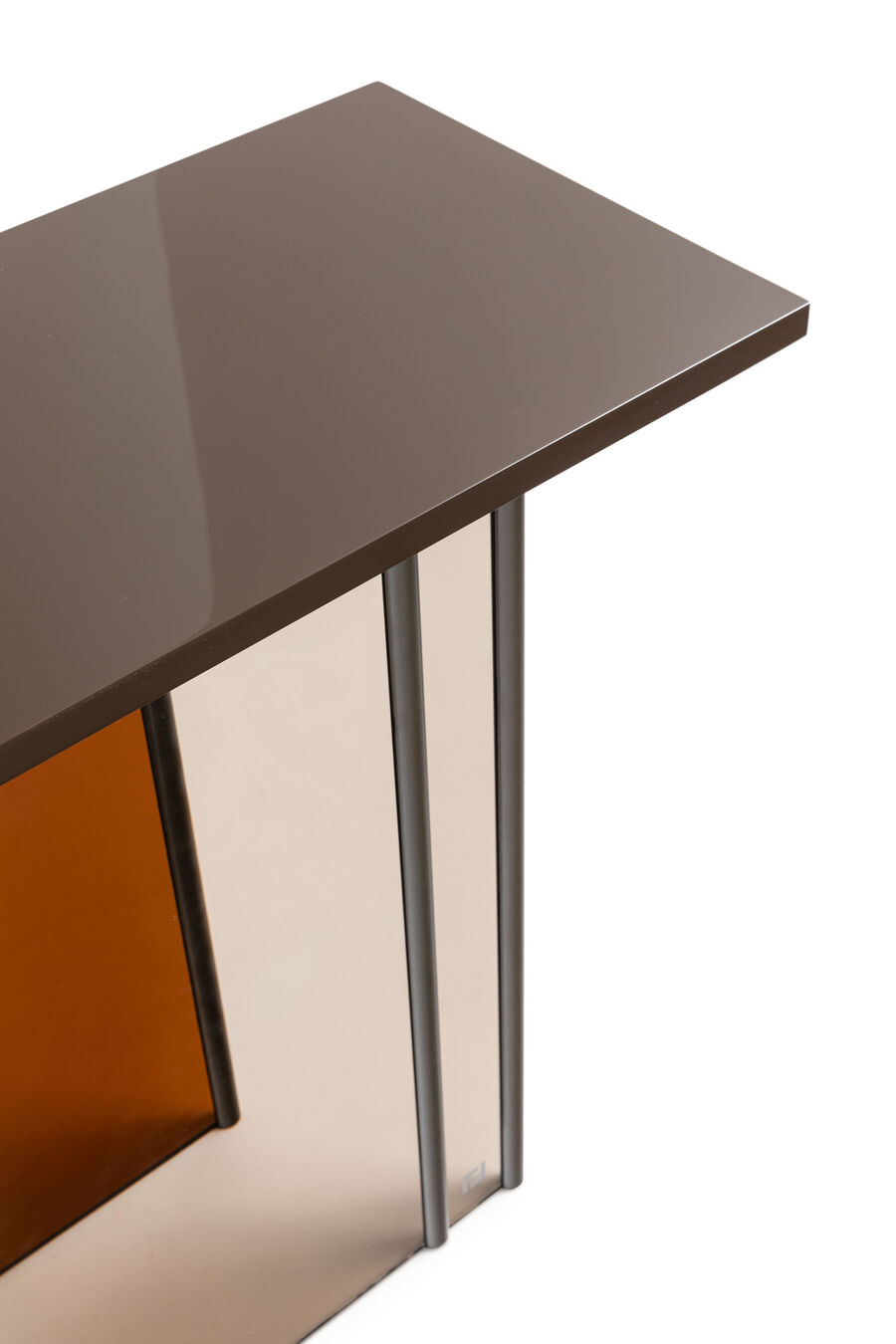 A combination of overlapping textures defines the aesthetic of the Blurred console. The essential geometric structure is expressed through a refined see-through effect, achieved by a combination of various layers of glass that merge with metallic tubes, creating a visually impactful design. Exuding lightness and personality, this console will enrich the main living spaces or an entryway.