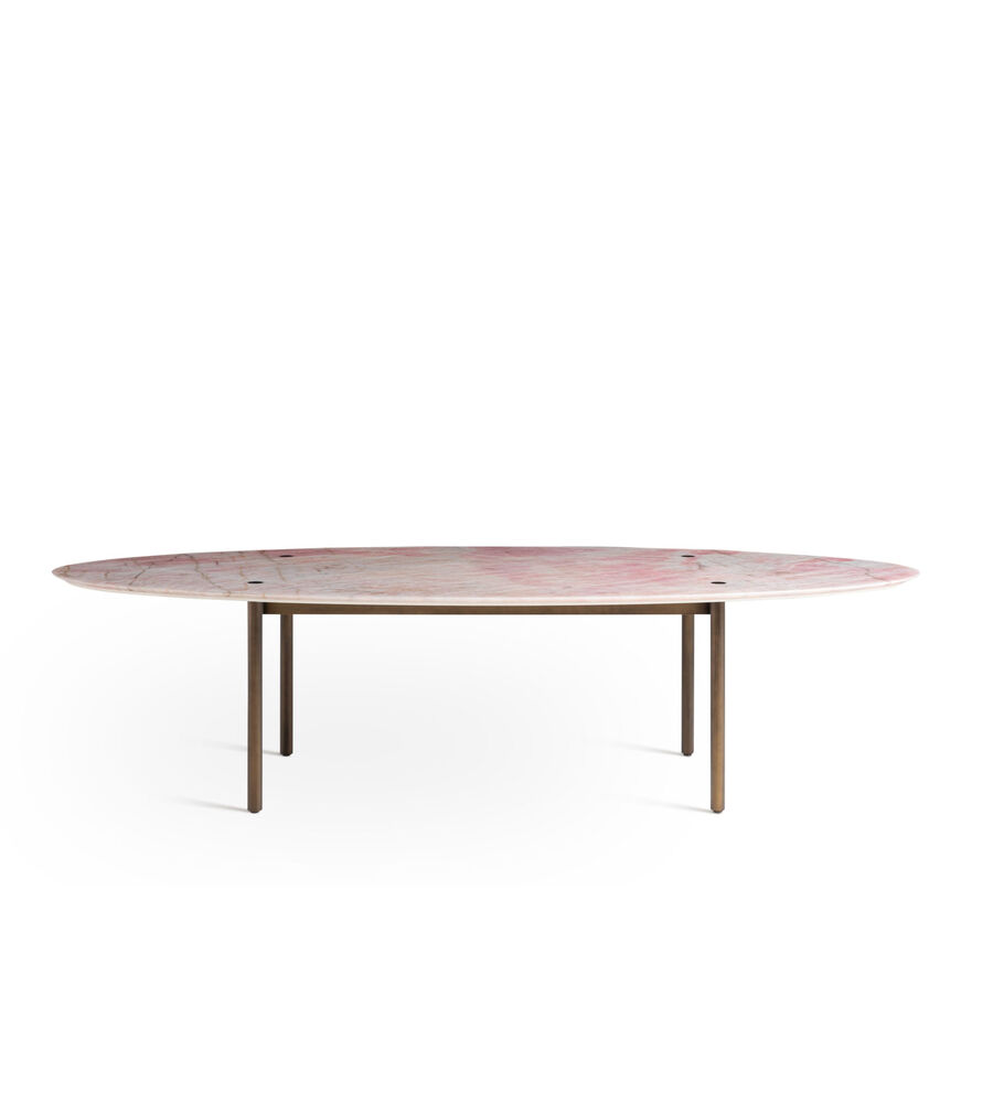 The latest addition to the Totu line, in perfect harmony with the project's visual lightness and materic combinations. This generously sized dining table is designed by Toan Nguyen using three different marbles, arranged to recreate the Astuccio motif – a heritage Fendi workmanship. The tubular metal legs, a distinguishing element of the project, are seamlessly inserted in the table top and detailed with the FF logo for an instantly recognisable touch.