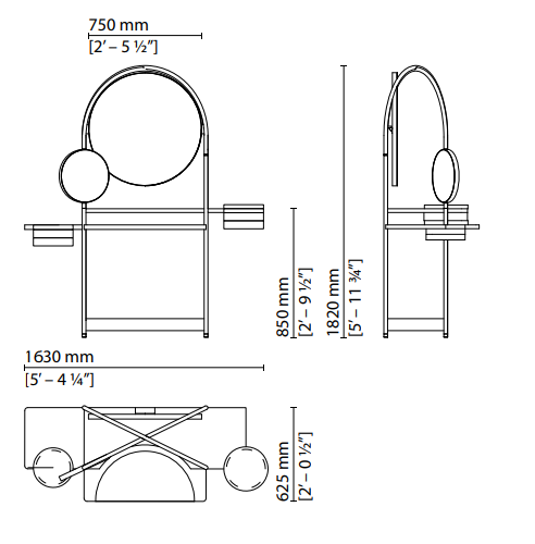 The Vanitoso dressing table, designed by Atelier O?, is a stylish homage to femininity. The steel structure and duo of round mirrors create an intriguing interplay of light reflections, unusual geometric forms and sinuous lines. The base and top in honed marble create a sophisticated tactile contrast with the shelf in American walnut or oak while leather detailing adds an elegant touch of the distinctive colour that has long been synonymous with Fendi creations.