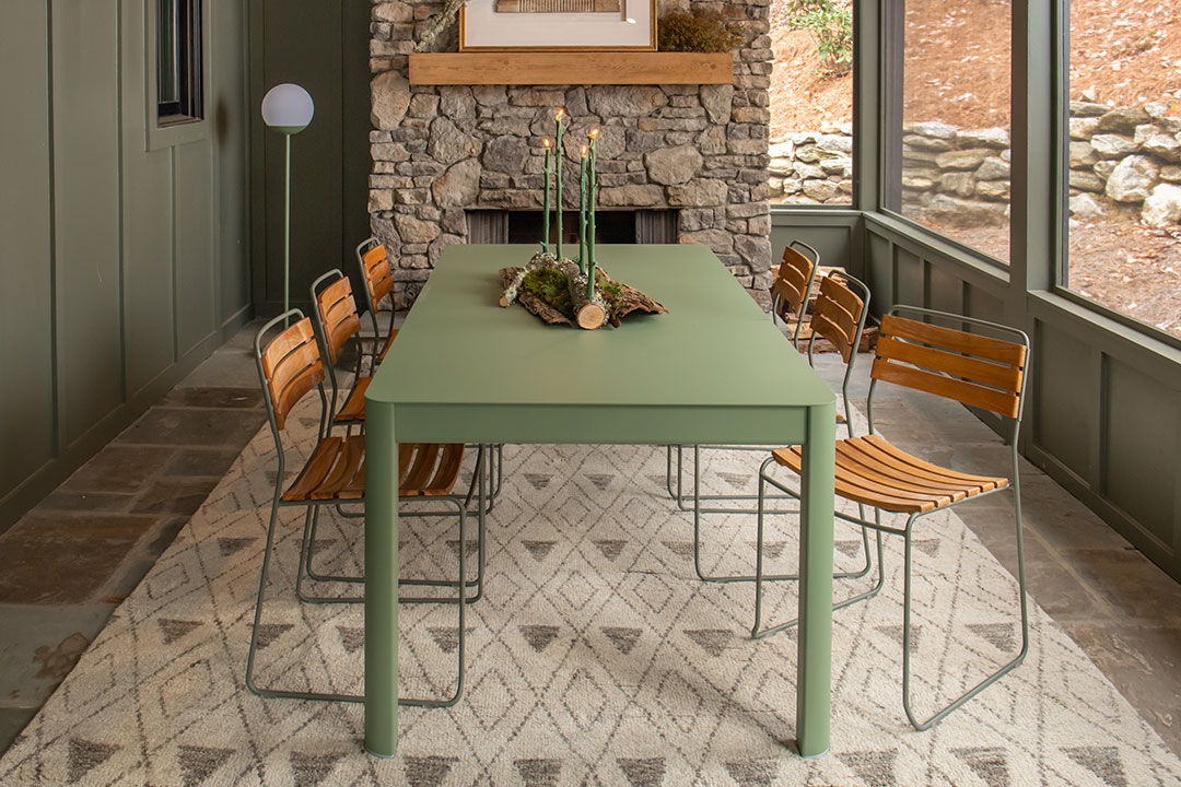 Avec ou sans son allonge, la table métallique Ribambelle peut accueillir 6 ou 8 convives sans aucun encombrement des pieds. Son système télescopique avec glissières à roulements est ultra pratique pour insérer l'allonge et offrir 2 places supplémentaires en un tour de main. Ultra pratique aussi le coffre de rangement dissimulé sous la table pour y stocker cette allonge.