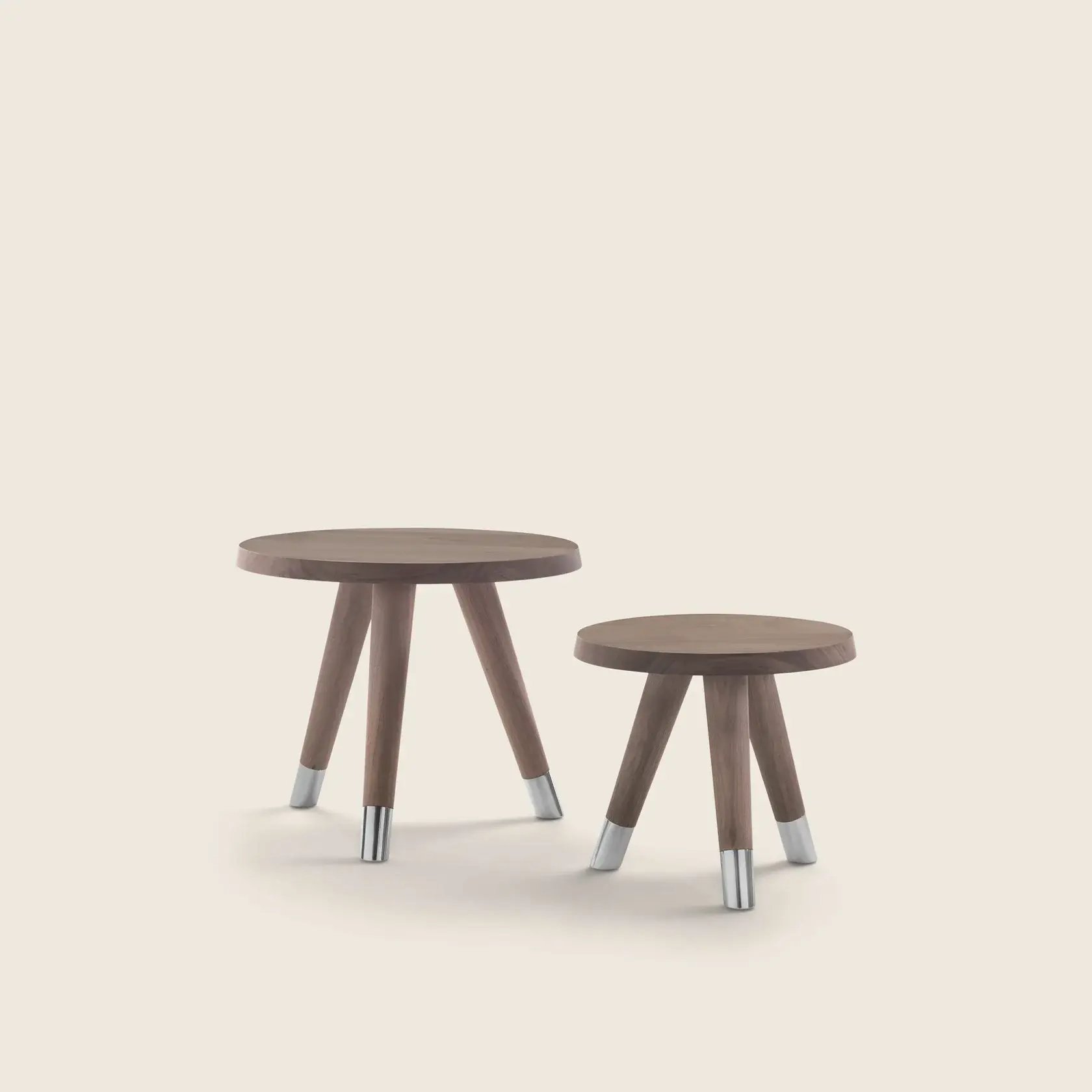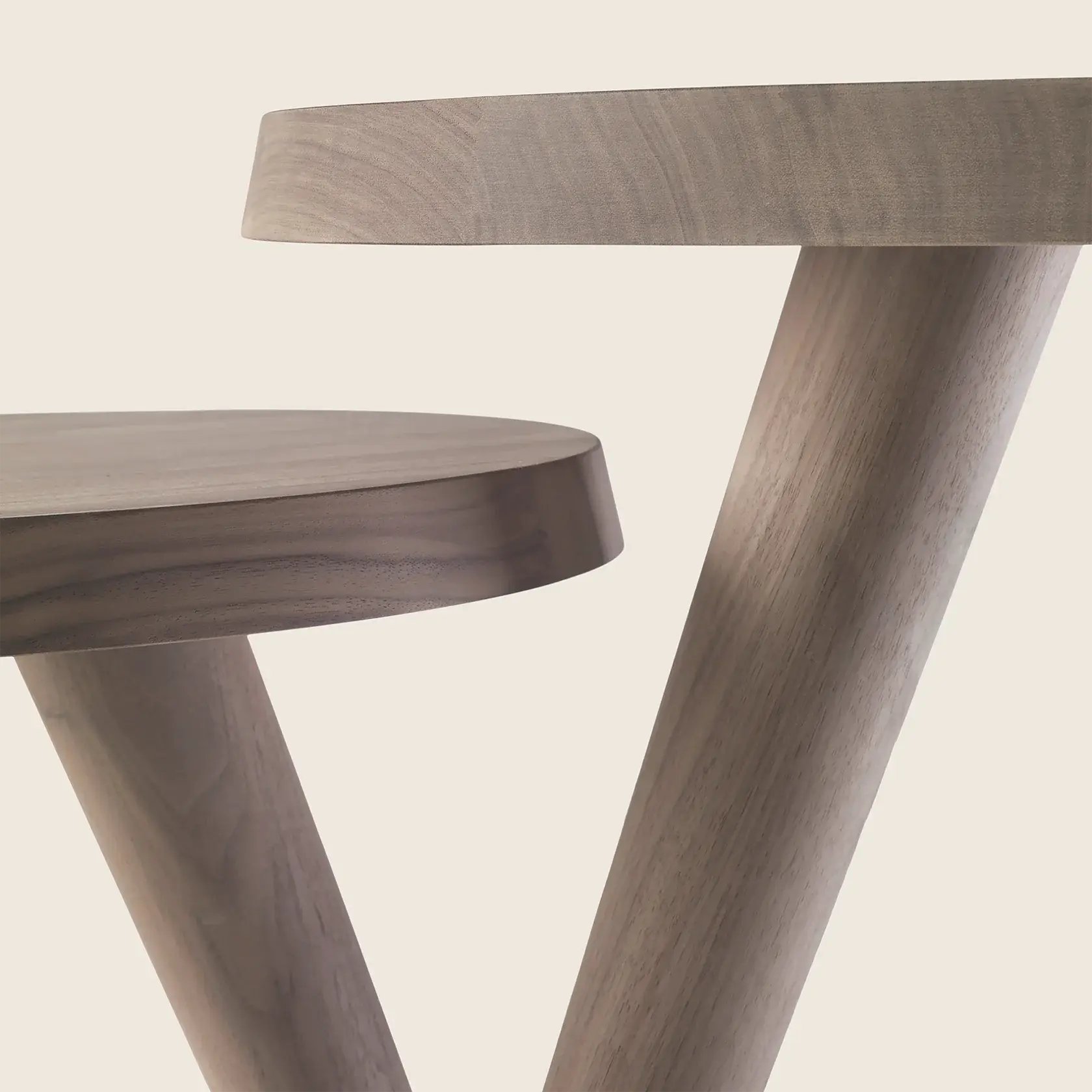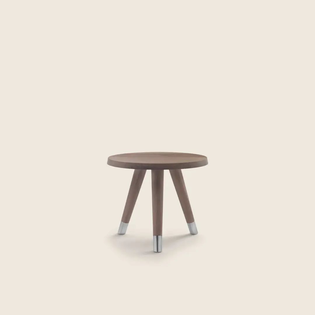 A minimalist-inspired support base composed of tapered legs in turned wood finished with elegant metal tips supports thick tabletops with rounded corners.