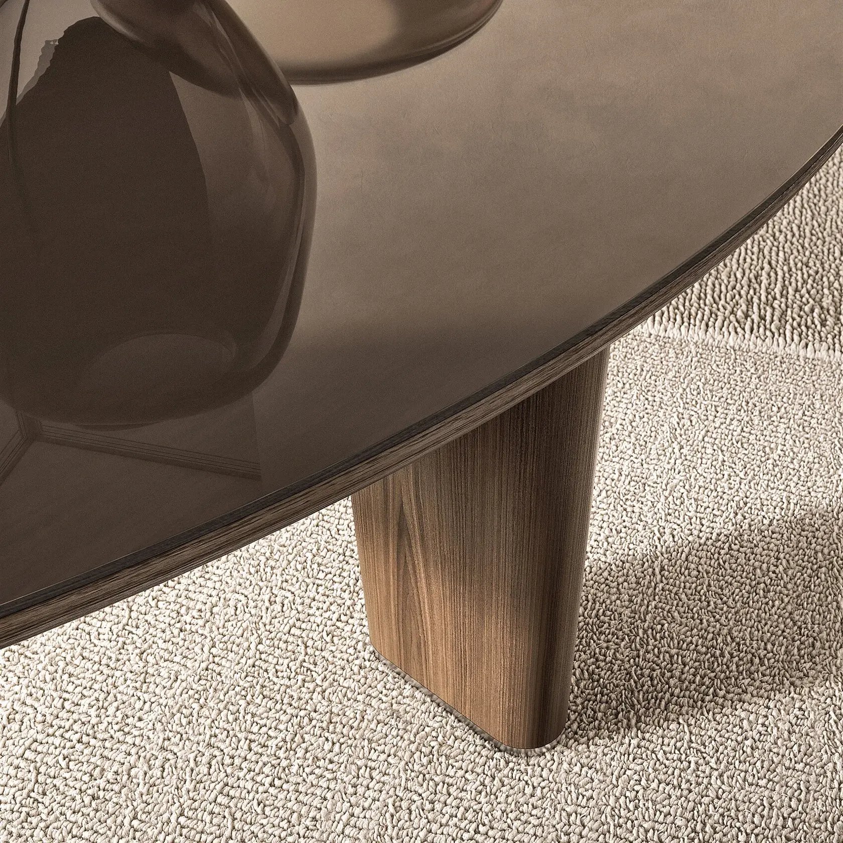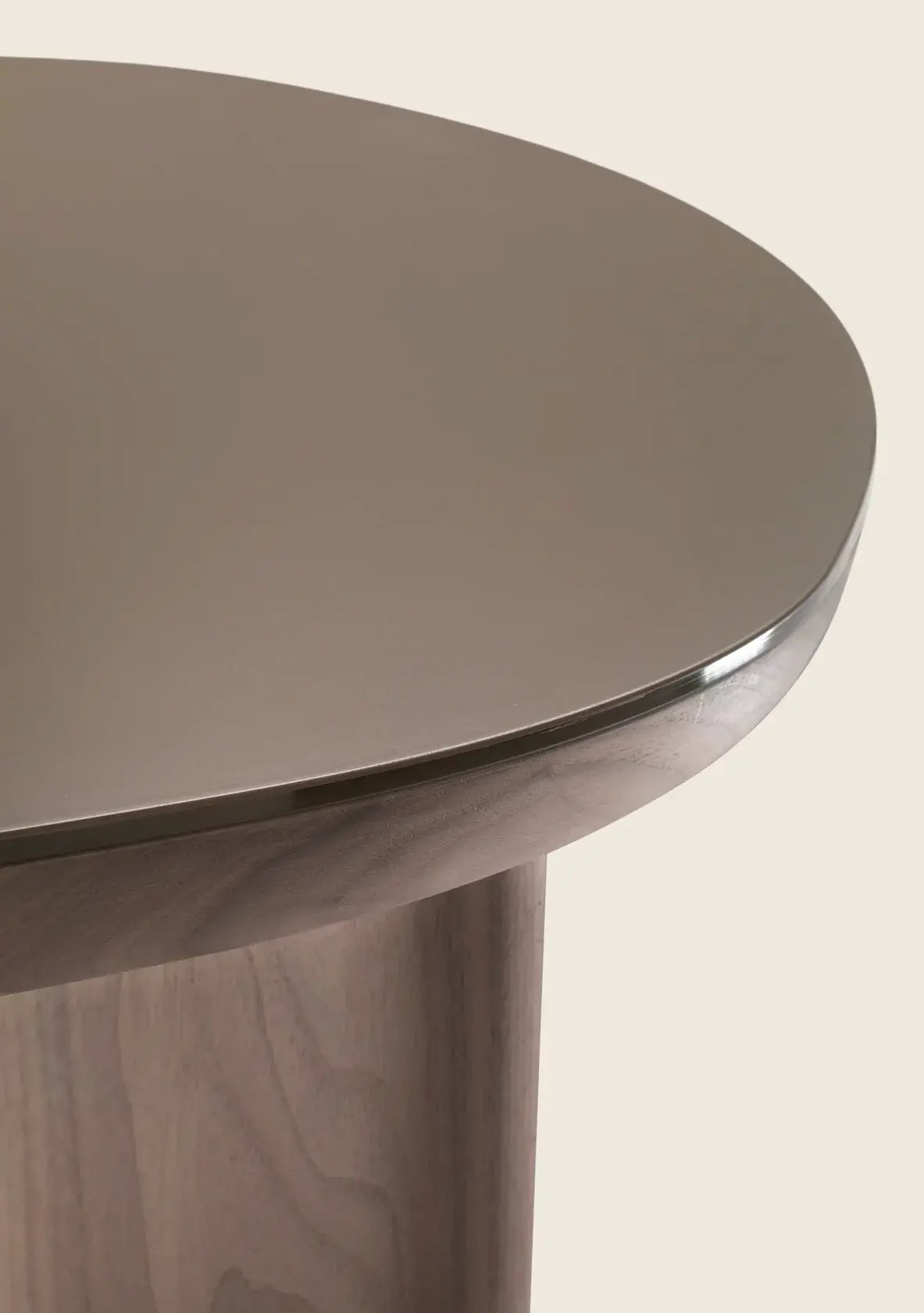 While the design is based on a single-material concept, in addition to veneered wood, the tabletop is also available in back-painted glass, in a palette of sophisticated colors.