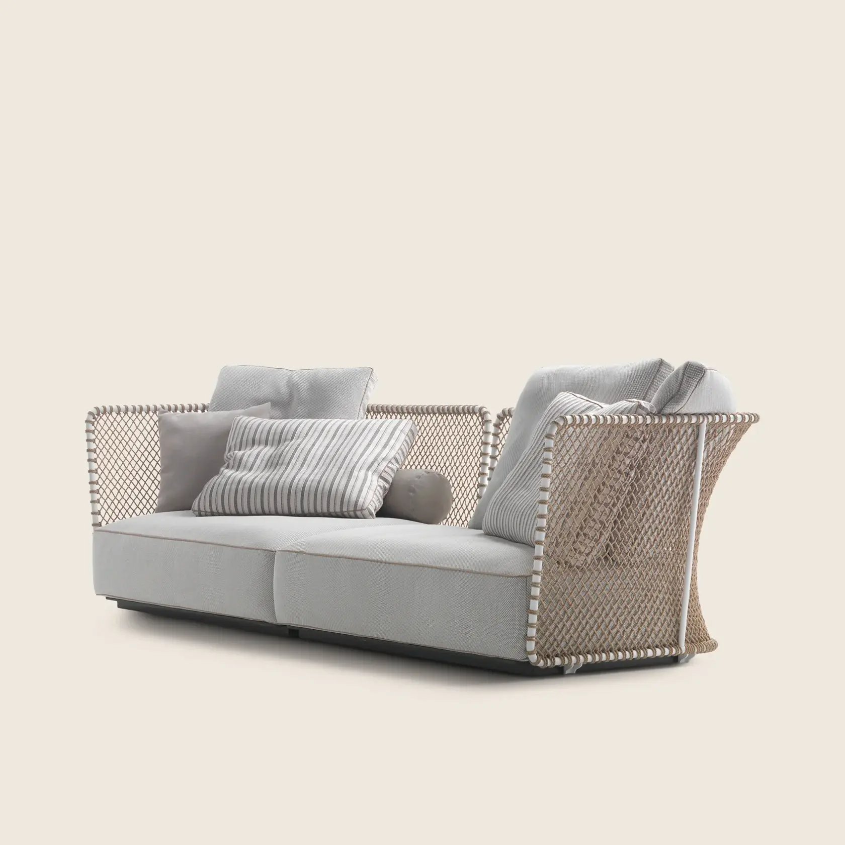 Its generous woven cord-and-metal backrest with a mesh-like pattern forms the aesthetic motif that lends bold personality to the Oasis sofa.