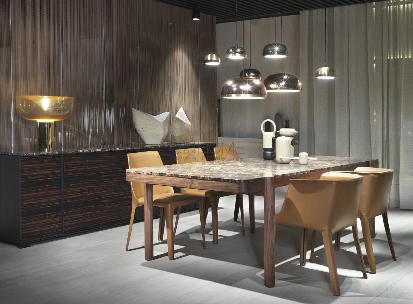Gustav桌子的設計顯示出對考究細節的追求,以實木雕花桌腿與桌板的嵌接為代表。這一細節看似簡單,卻蘊藏著桌面的復雜構造。 Gustav桌子有圓形和長方形兩個版本,并有不同尺寸,提供一系列的原創材質搭配,可選擇多種顏色的卡納萊托胡桃木或歐洲白蠟木結構搭配Carrara白色、Marquinia黑色、Calacatta金色和 Emperador黃色等款式的大理石桌面。