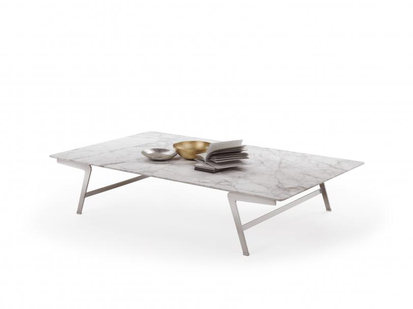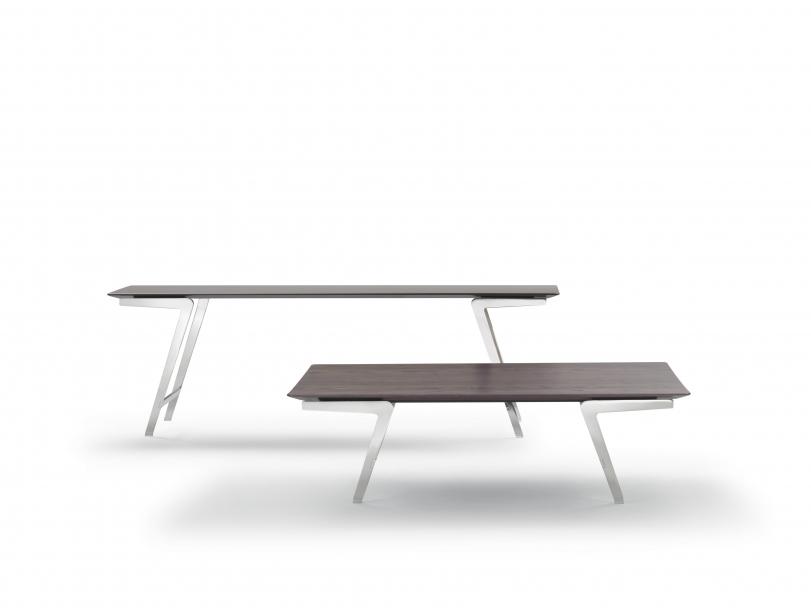 Soffio桌子、茶幾和墻邊柜系列,呈現嚴謹的建造結構。 扁平的金屬支腿是這款桌子的設計特點。桌腿輕盈向上延伸,勾勒出獨特的“飛鏢”形,把桌子特別具有動感地托離地面。 Soffio茶幾既結實又空靈,輕盈的金屬底座與簡約的長方形桌面構成饒有趣味的對比。金屬底座表面處理有磨砂、鍍鉻、磨光、黑鉻與香檳色,桌面可選用多種顏色的卡納萊托胡桃木或歐洲白蠟木,或名貴的大理石。