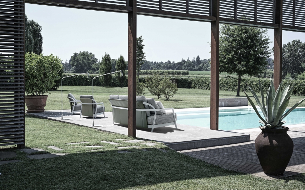 Alison扶手椅的戶外版本在保持著原設計的高品質(zhì)基礎上,沿伸出兩人座,三人座。采用可保證出色戶外表現(xiàn)的材料。 框架的結(jié)構(gòu)采用擠壓鋁材,表面涂層為環(huán)氧粉末噴漆,可選白色,卡其綠,酒紅色,磨光及磨砂鋁材,而底座則是采用航海復合板制成。 聚氨酯橡膠靠背色彩系列包括天然色調(diào)、波爾多色和橄欖綠色,而坐墊和靠墊則可以選擇戶外面料系列的所有織物。