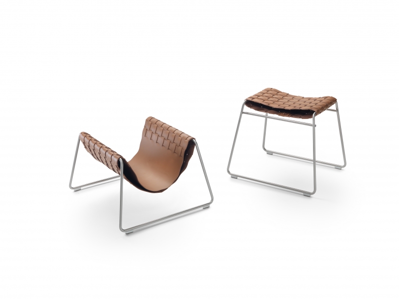 In contrast to the rigid metal structure, the upper part is made entirely of pliable hand-woven cowhide.