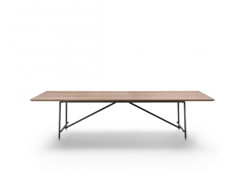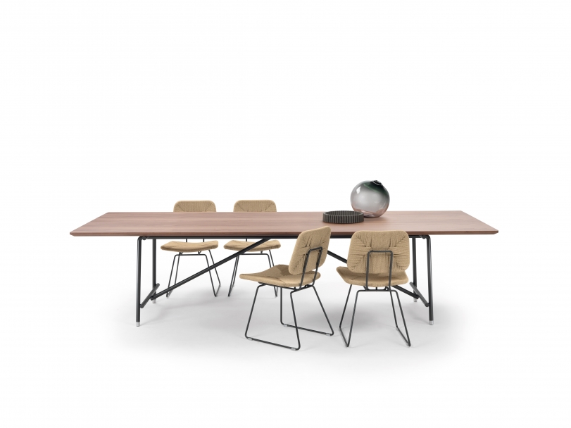The metal structure of the Any Day dining table has uncluttered lines and is available in many finishes, while the tops come in Canaletto walnut or ash veneer; with glossy lacquer finish in a palette of sophisticated shades; or in various types of luxurious marble.
